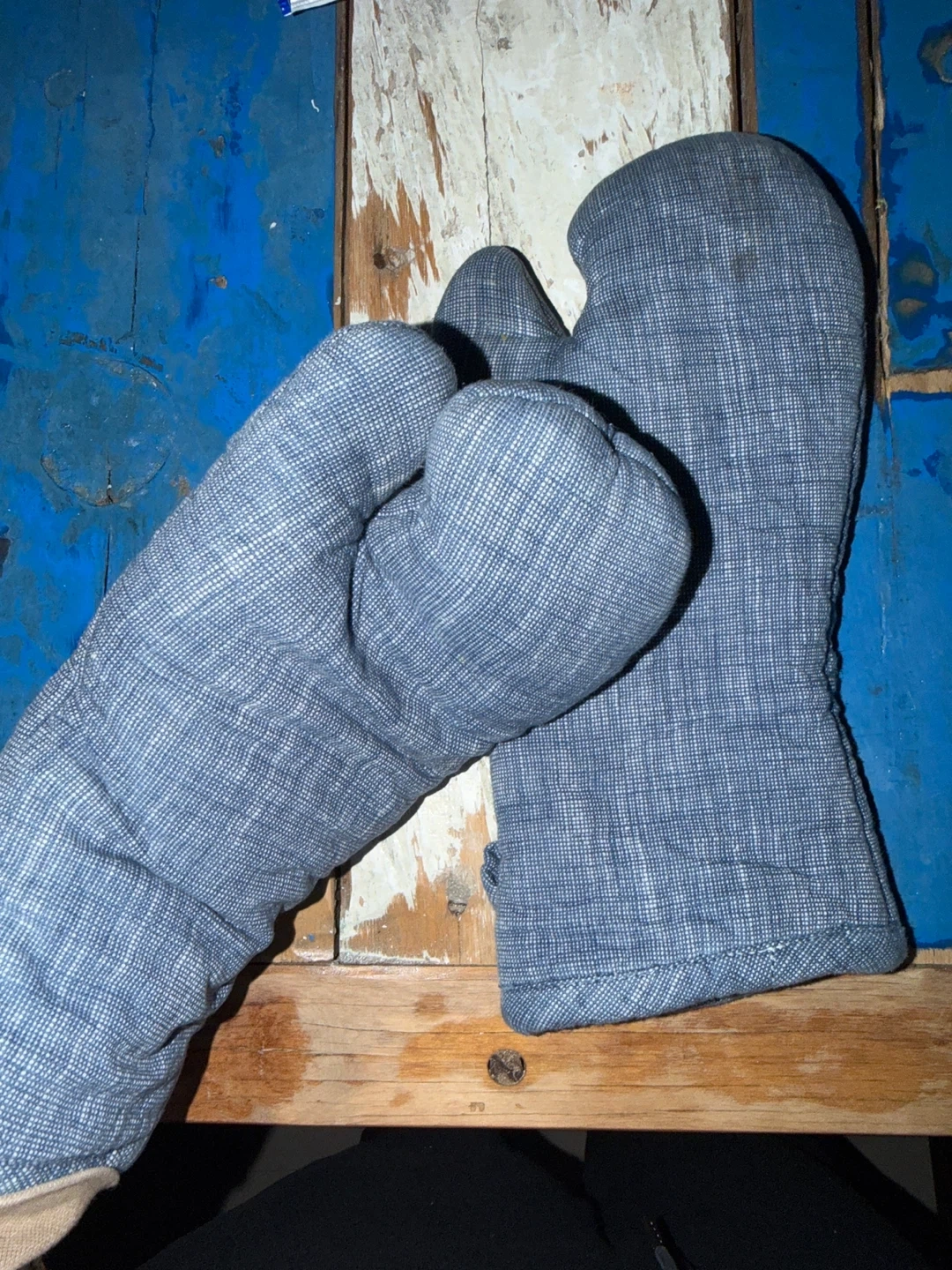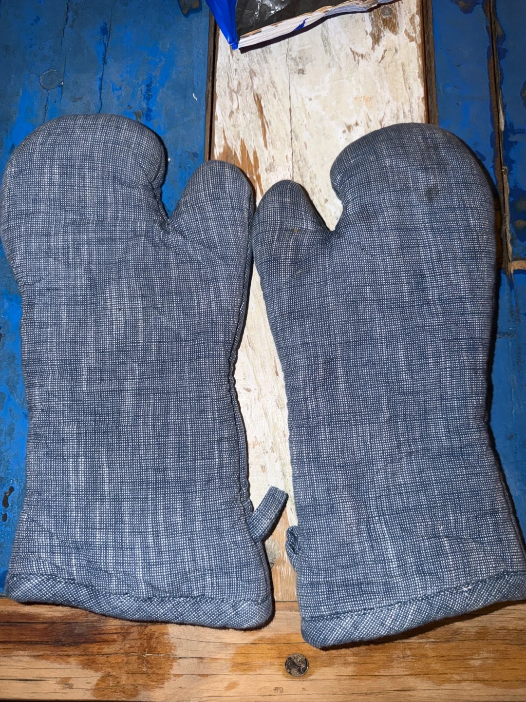 Selling a pair of blue oven mitts! They're in great condition, perfect for handling hot pots and pans in the kitchen. They have a nice, thick padding to protect your hands from the heat. Ready for a new home!