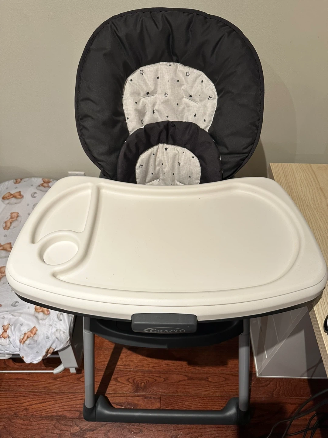 This is a Graco high chair with a removable tray. It has a padded seat and adjustable straps. Great for feeding time 240 original price