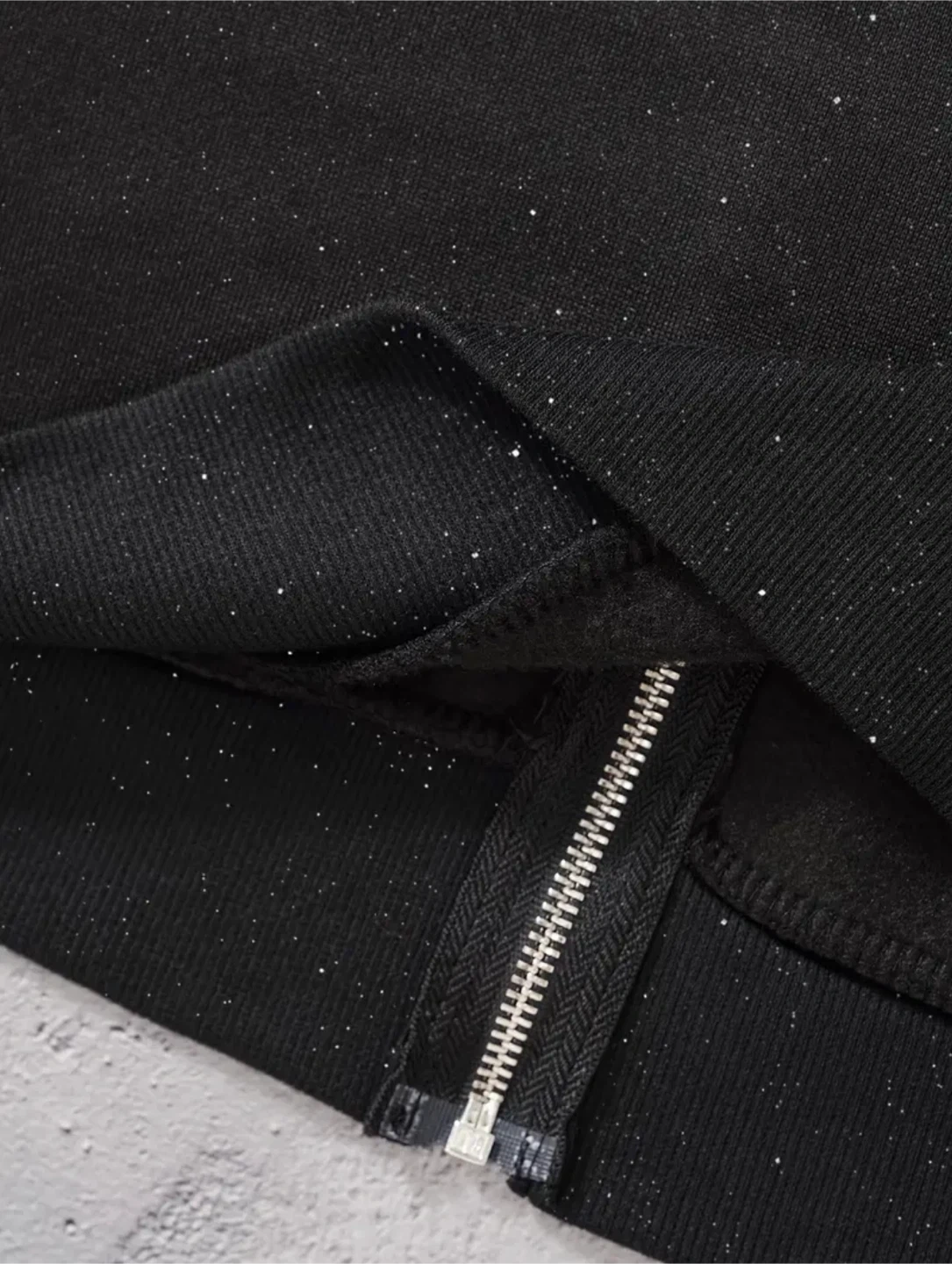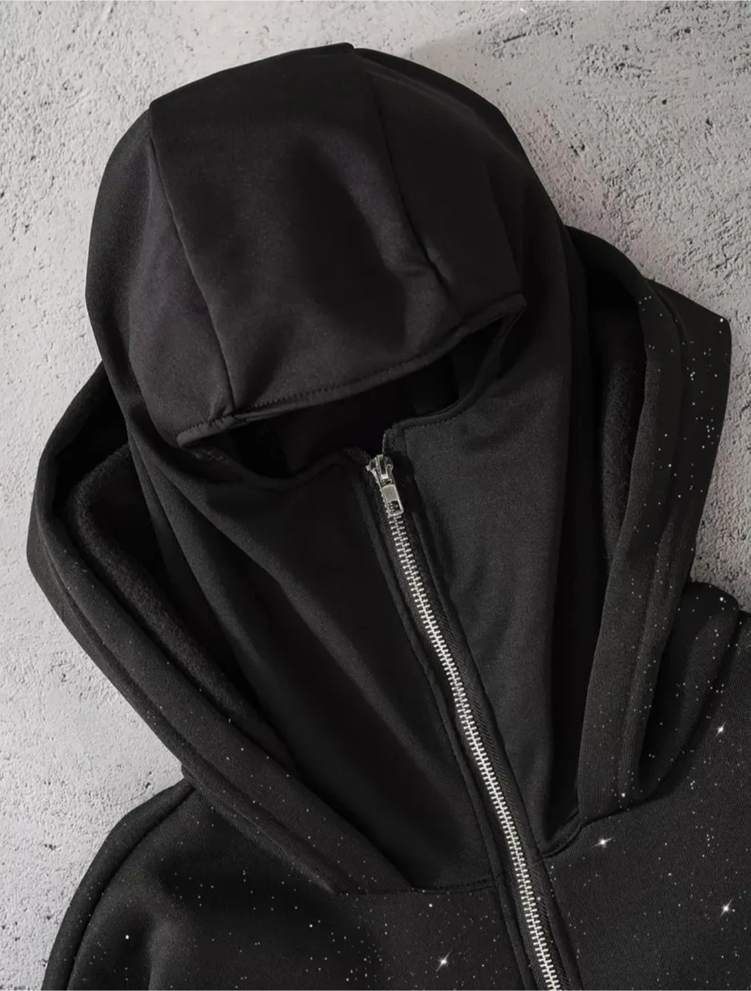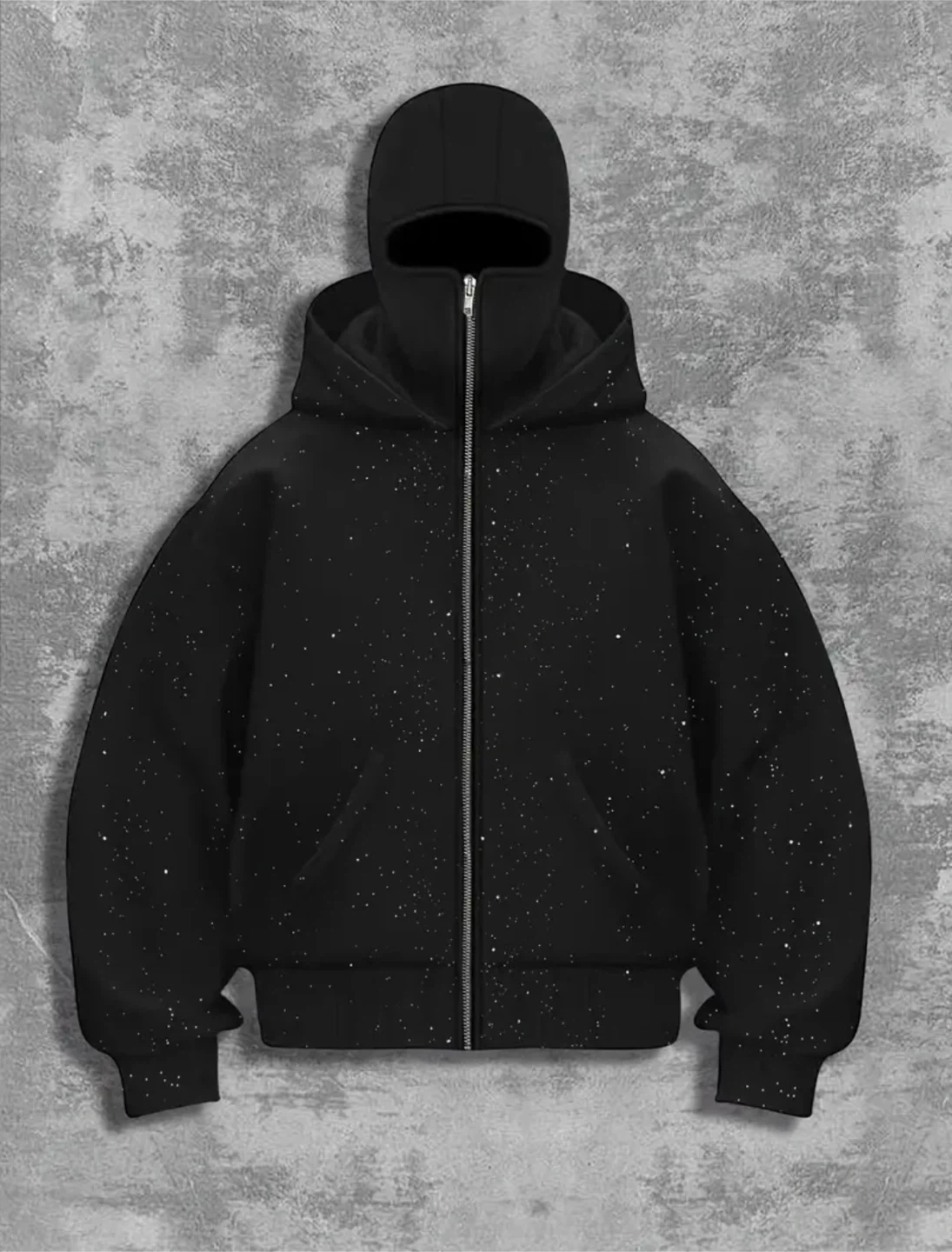 New, unworn black zip-up hoodie features a built-in balaclava for full face coverage. It's adorned with subtle glitter accents, giving it a unique starry night effect. Size M.