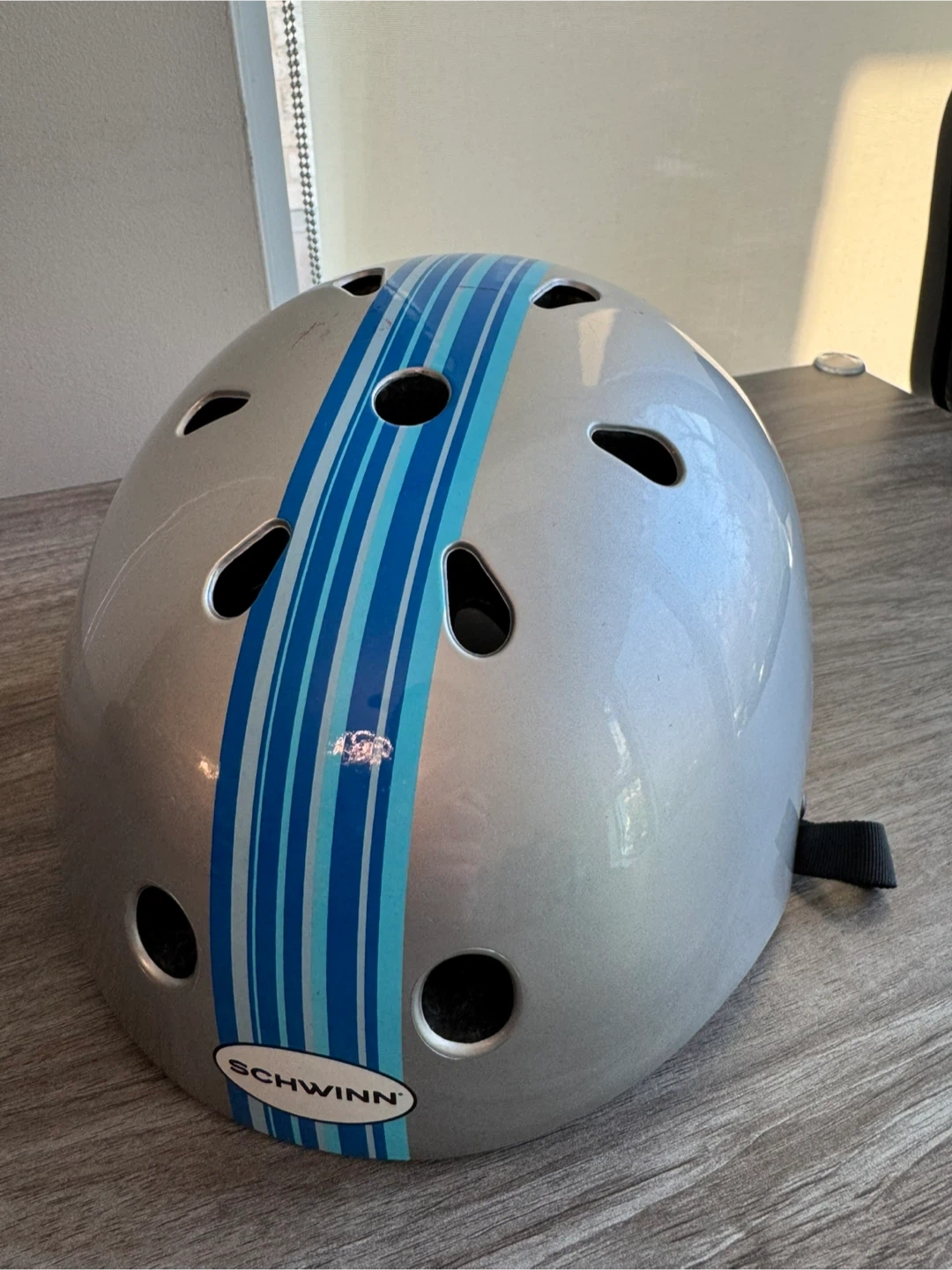 This is a Schwinn bike helmet in silver with blue stripes. It's designed for cycling and features vents for airflow. The adjustable straps ensure a snug fit for safety.