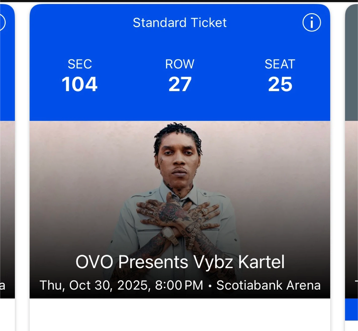 5Selling two tickets to OVO Presents Vybz Kartel at Scotiabank Arena on Thursday, October 30, 2025 at 8:00 PM! - Section 104, Row 27, Seat 25 - Section 104, Row 27, Seat 24