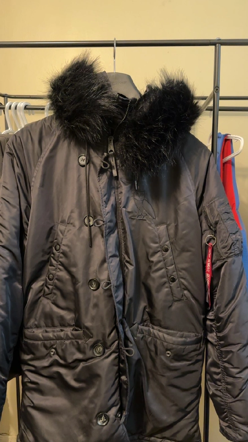 21Selling an OVO x Alpha Industries parka. It's a stylish and warm jacket, perfect for the Canadian winter. Features a fur-trimmed hood and a sleek design. Great for staying cozy and looking good!