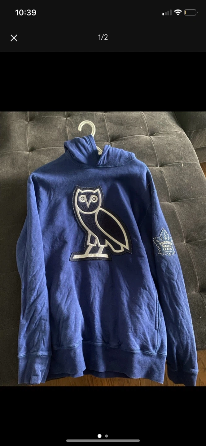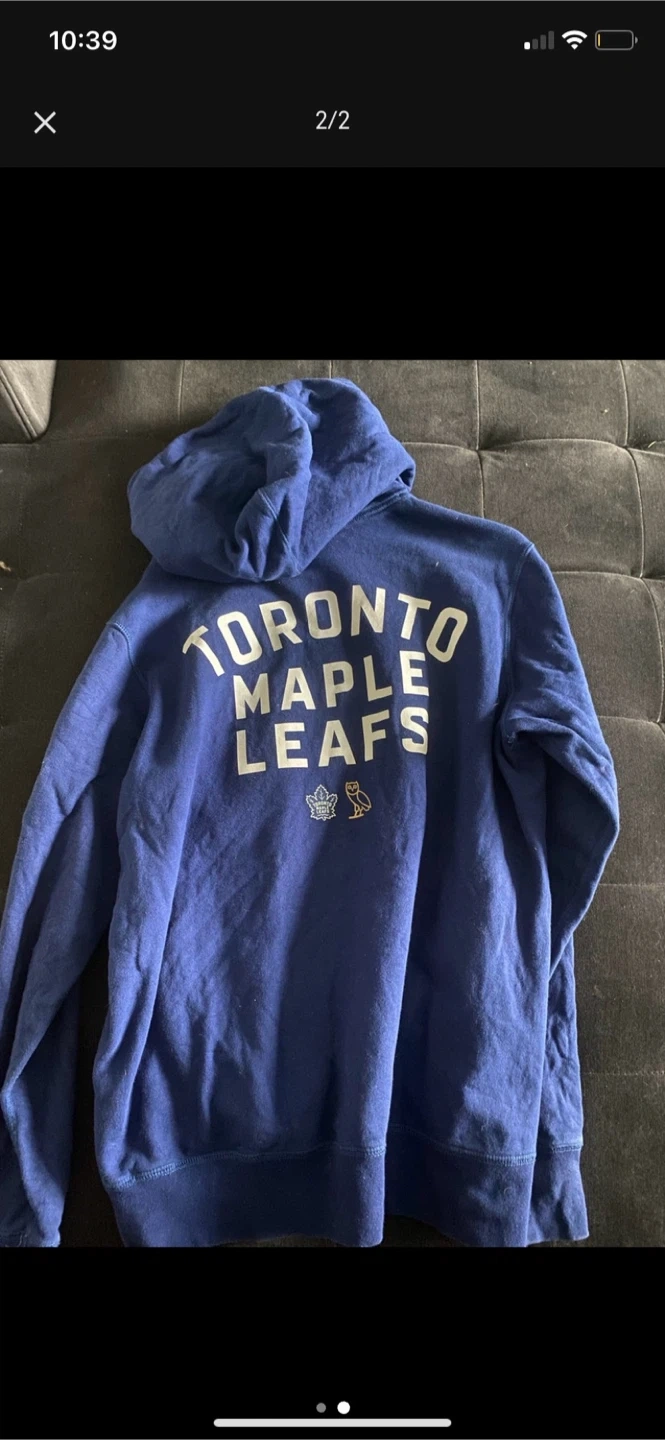 Selling a OVO x Toronto Maple Leafs hoodie. It's in great condition and features the iconic OVO owl logo on the front and the Toronto Maple Leafs logo on the sleeve. The back has 'TORONTO MAPLE LEAFS' printed across the shoulders. A must-have for any Leafs fan!