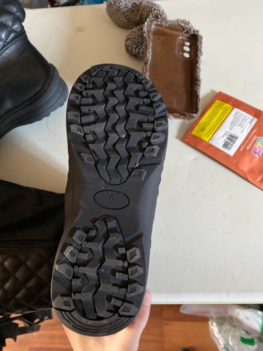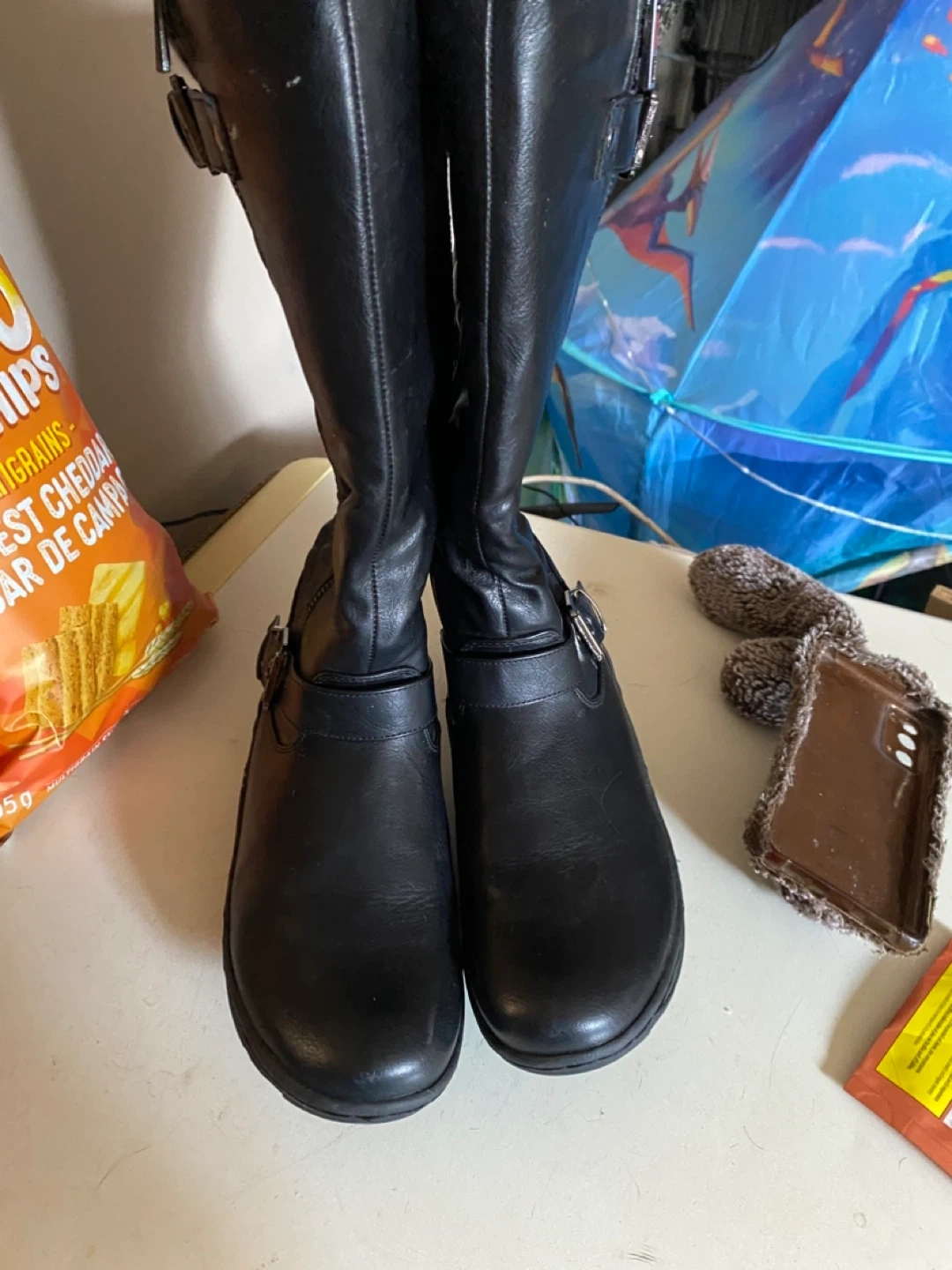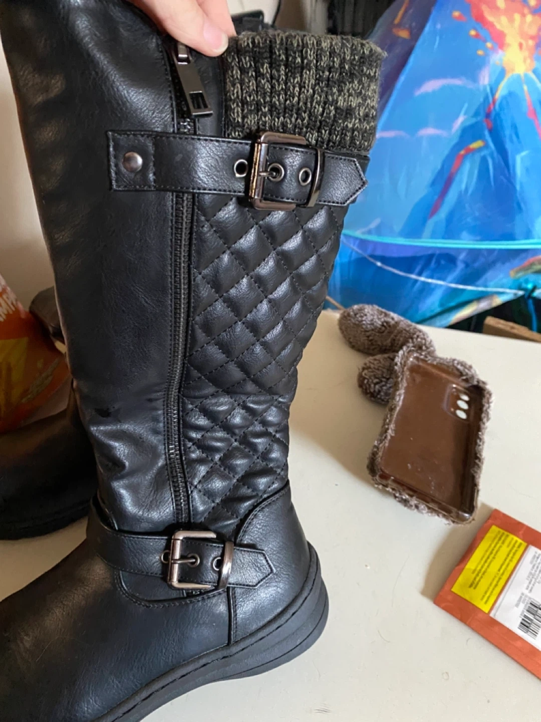 These black knee-high winter boots have a quilted shaft and decorative buckle straps. They feature a side zipper for easy on and off. The durable sole provides good traction. These boots are a size 6.