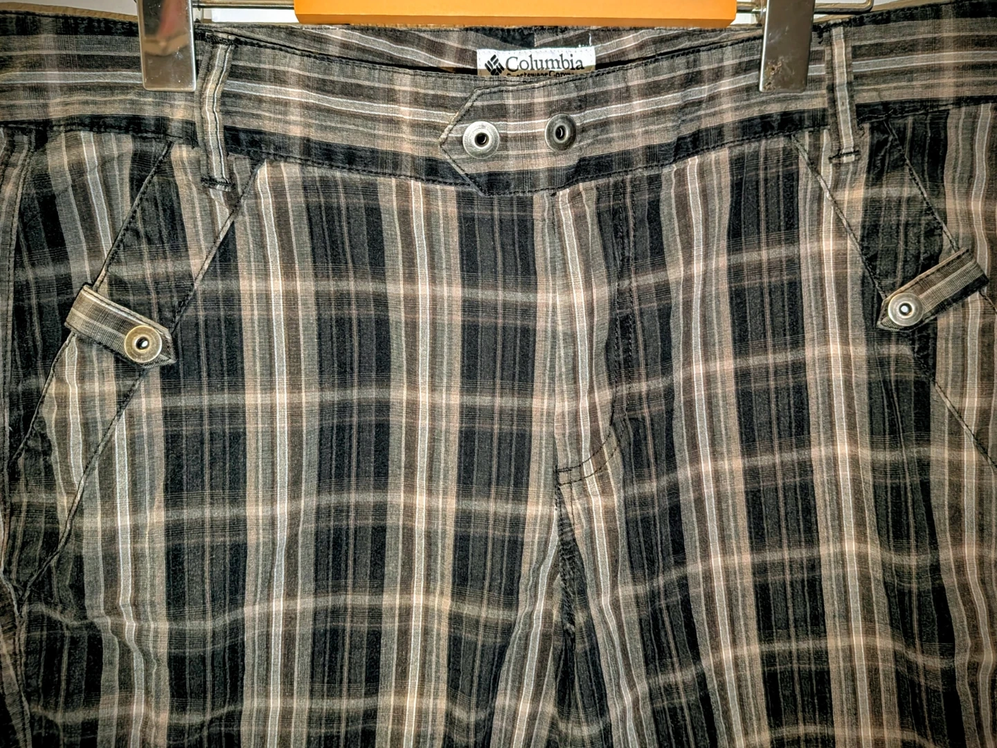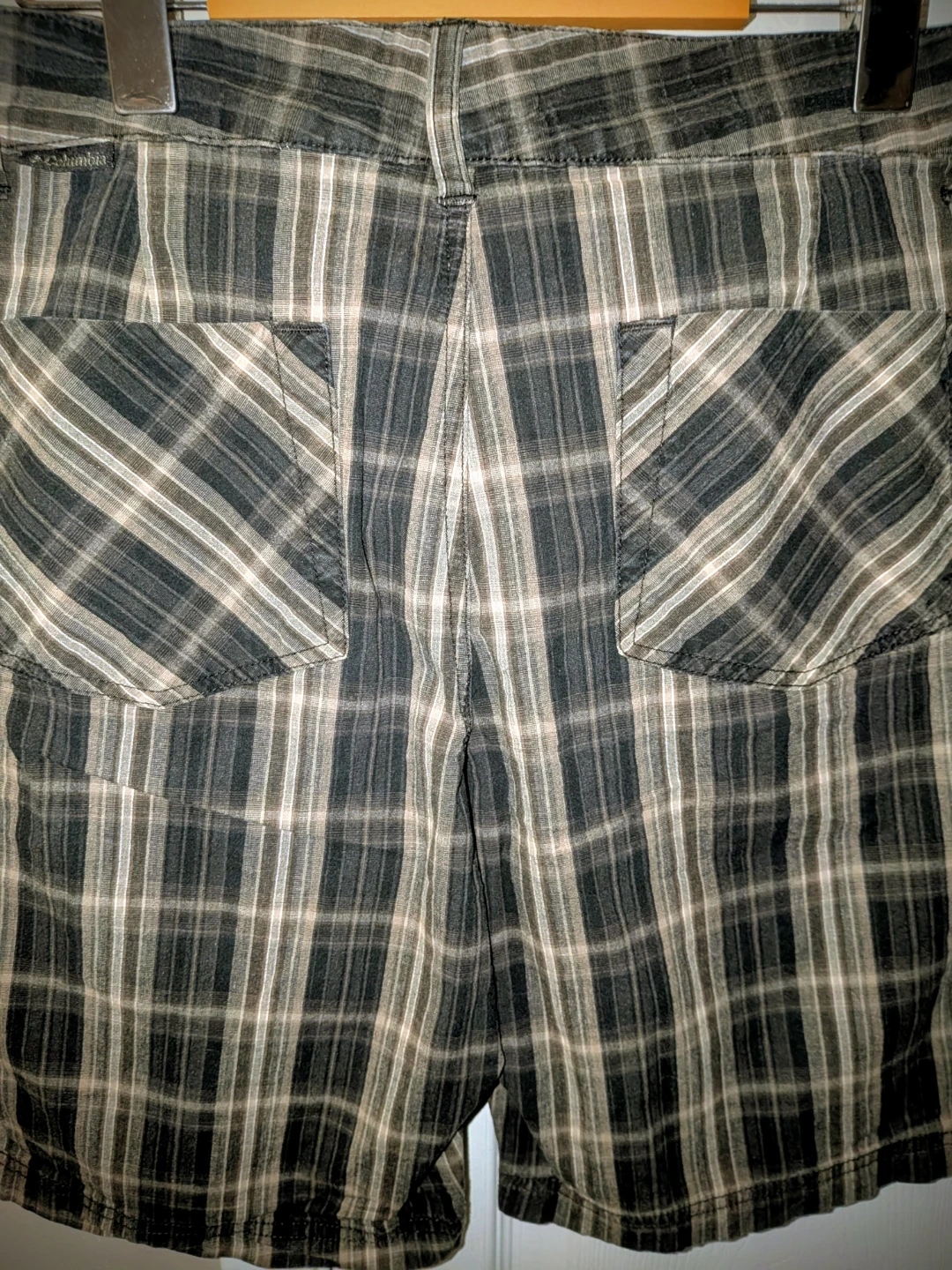 These Columbia shorts feature a plaid pattern. They have two back pockets with button closures. The material is a blend that's comfortable for outdoor activities.