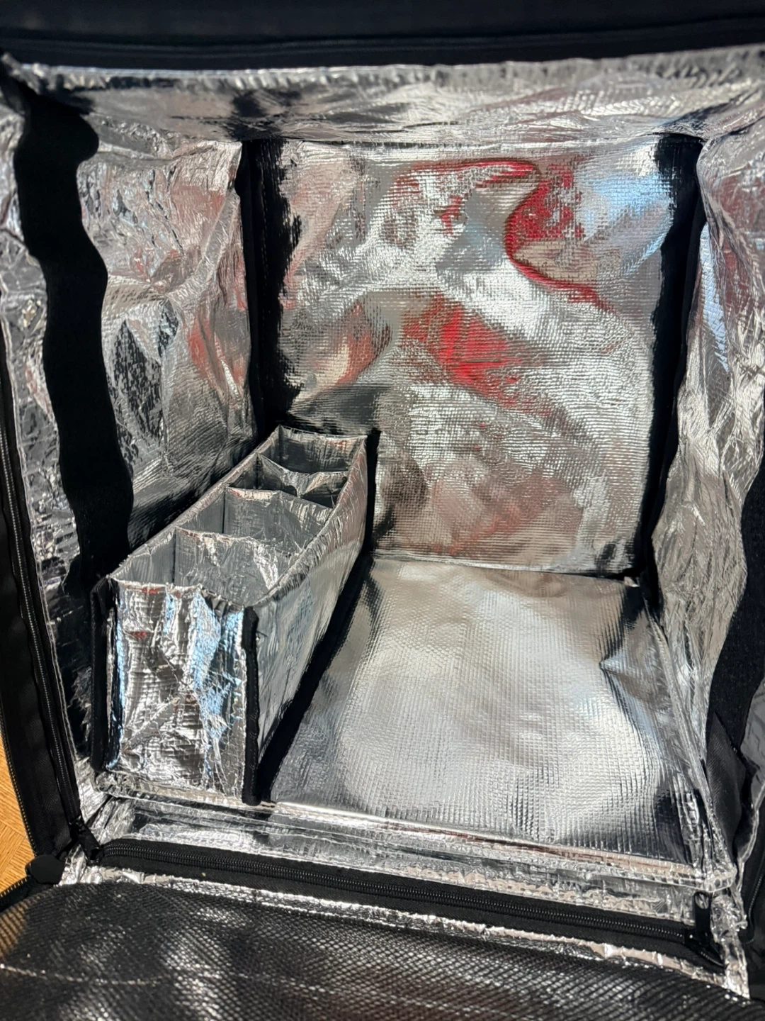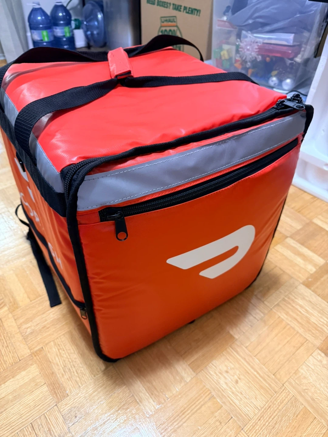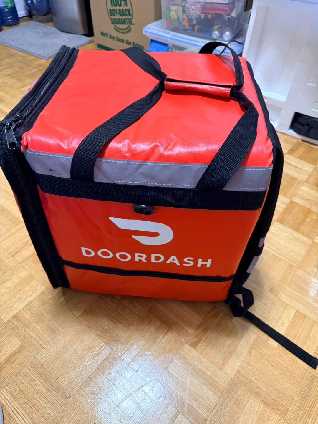 This is a DoorDash insulated delivery bag with a built-in organizer. It's designed to keep food hot or cold during transport. Comes with adjustable backpack straps for comfortable carrying. Great for food delivery drivers!