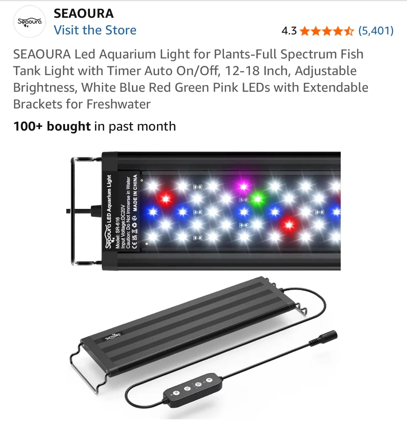 This SEAOURA LED aquarium light is designed for plants and fish tanks. It's 10W and fits 12-18 inch tanks. The light offers adjustable brightness and features white, blue, red, green, and pink LEDs with extendable brackets. It has a timer for auto on/off functionality.