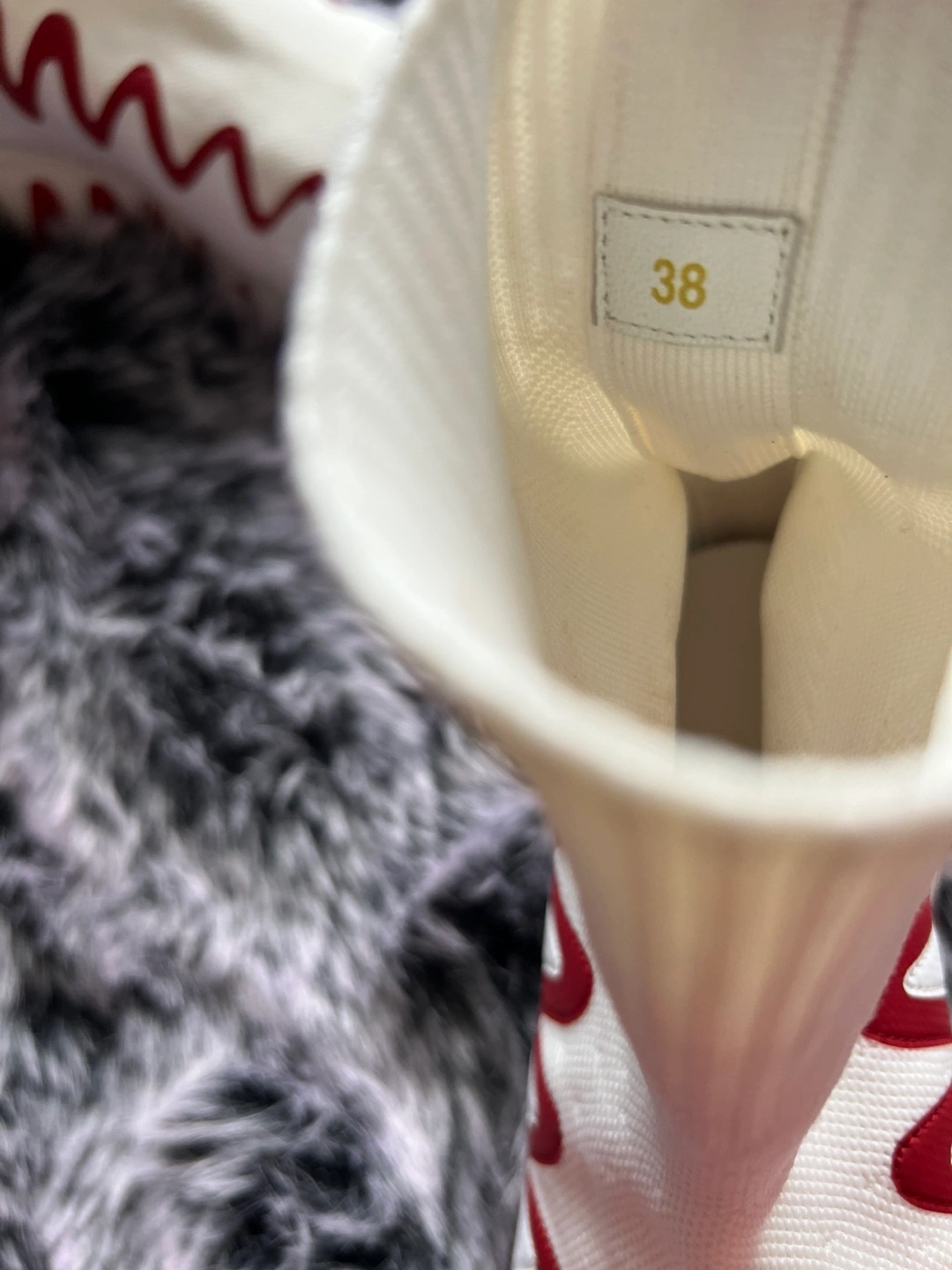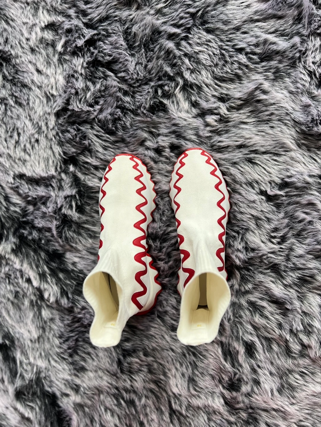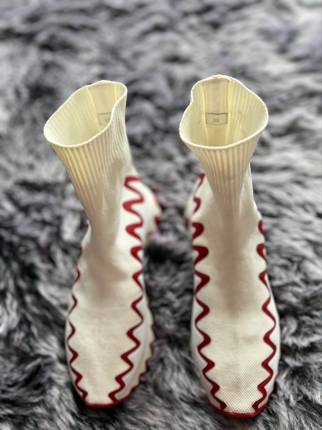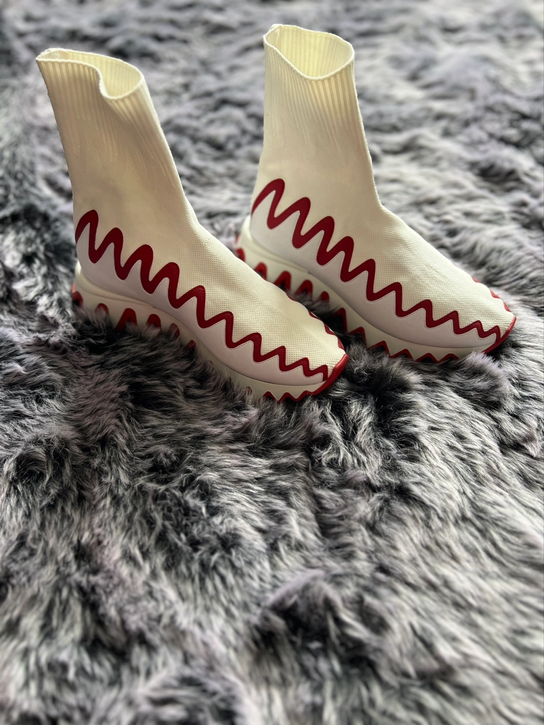 Brand New Authentic Christian Louboutin Sharky Sock Pull On Cream-coloured knit booties with red detailing. Unique wavy design. Size 38. Sock-like fit. Originally $1300 retail. Box not included. Serious buyers only.
