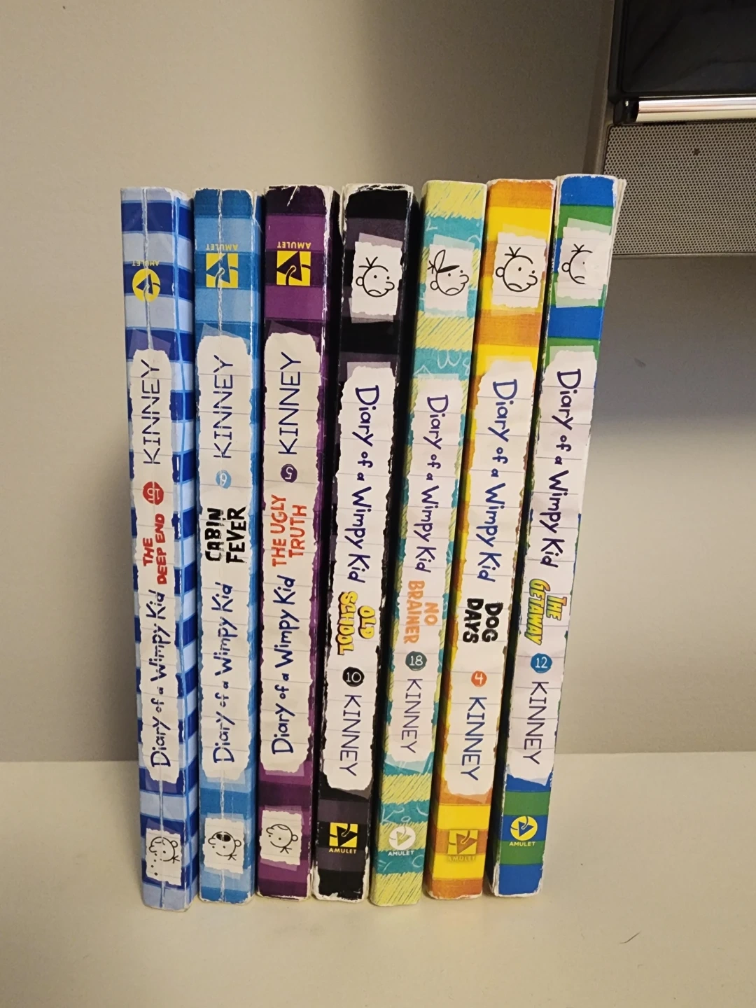 Selling a set of Diary of a Wimpy Kid books by Jeff Kinney! $5 eadh or all 7 for 30 Titles include The Deep End, Cabin Fever, The Ugly Truth, Old School, No Brainer, Dog Days, and The Getaway. Great for young readers!