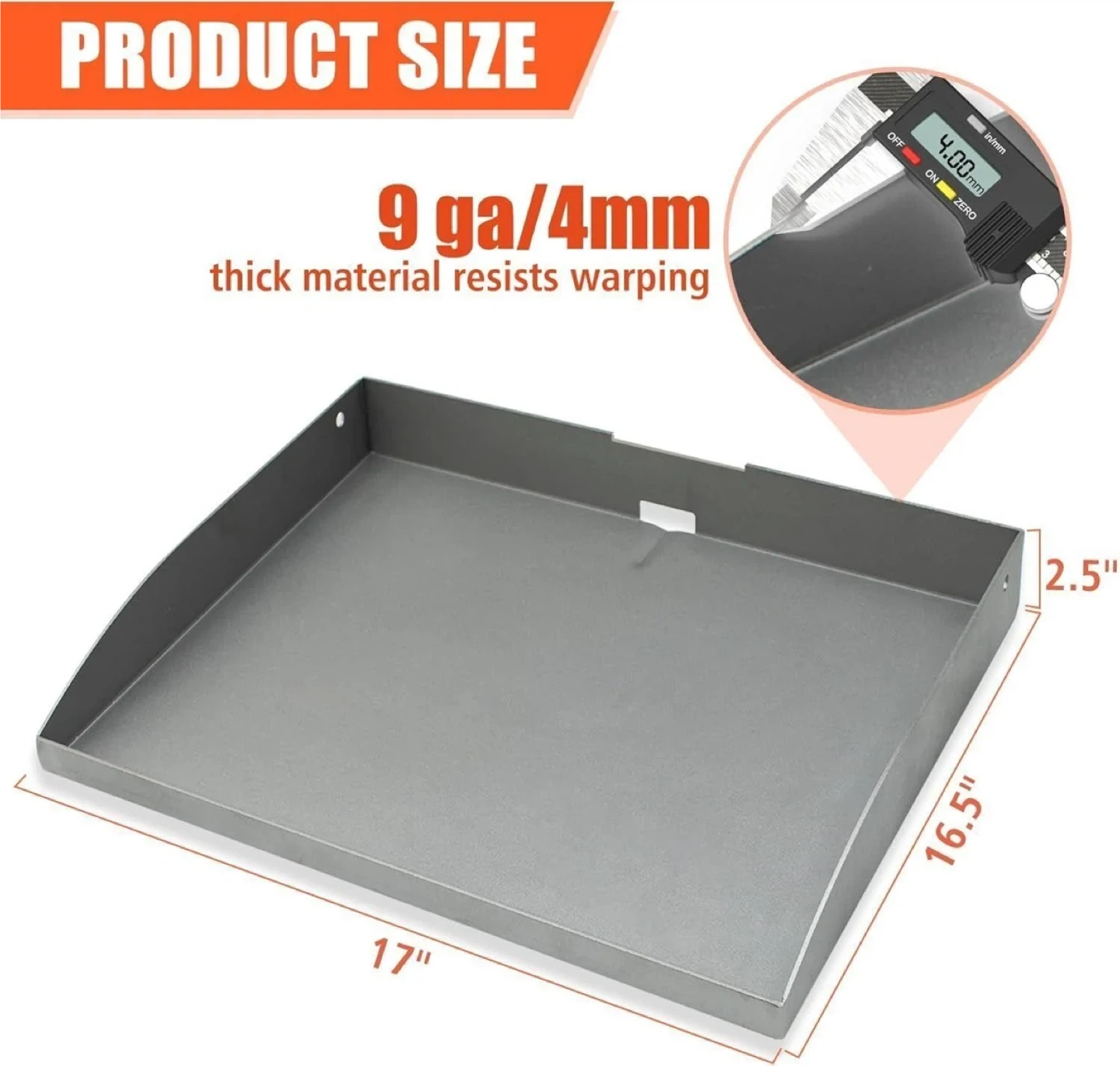 This is a replacement griddle plate for Blackstone 17 inch grills. It's made from 9 gauge or 4mm thick steel to resist warping. The plate measures 17 inches by 16.5 inches and is 2.5 inches deep. It fits multiple Blackstone models, including 1832, 1814, 1971, and 1650.