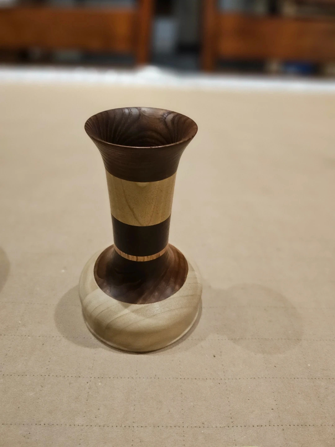 This is a handmade wooden vase, crafted from contrasting wood types for a unique look. It features a layered design with distinct bands of colour. Its compact size makes it suitable for displaying small dried flowers or as a decorative accent piece.