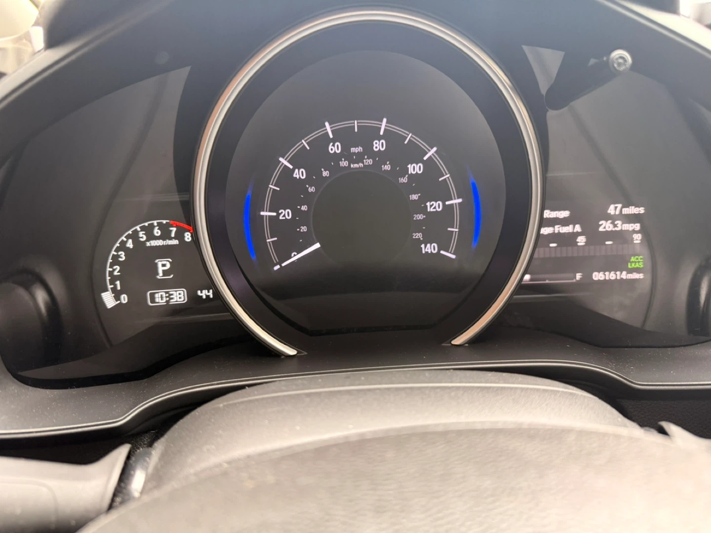 This is a silver Honda Fit. It has tinted windows and custom wheels. The odometer shows 61,614 miles. Fuel economy is 26.3 mpg. Título reconstruido puede en perfecta condición un pequeño accidente tuvo leve