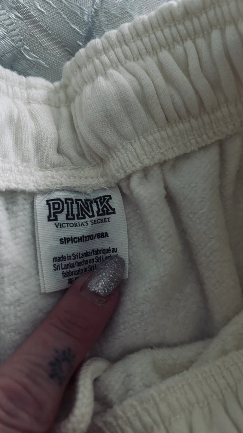 Two pairs of Pink VS pink sweatpants. One pair is black and the other is cream. Both are size small. Made from a comfortable cotton blend.