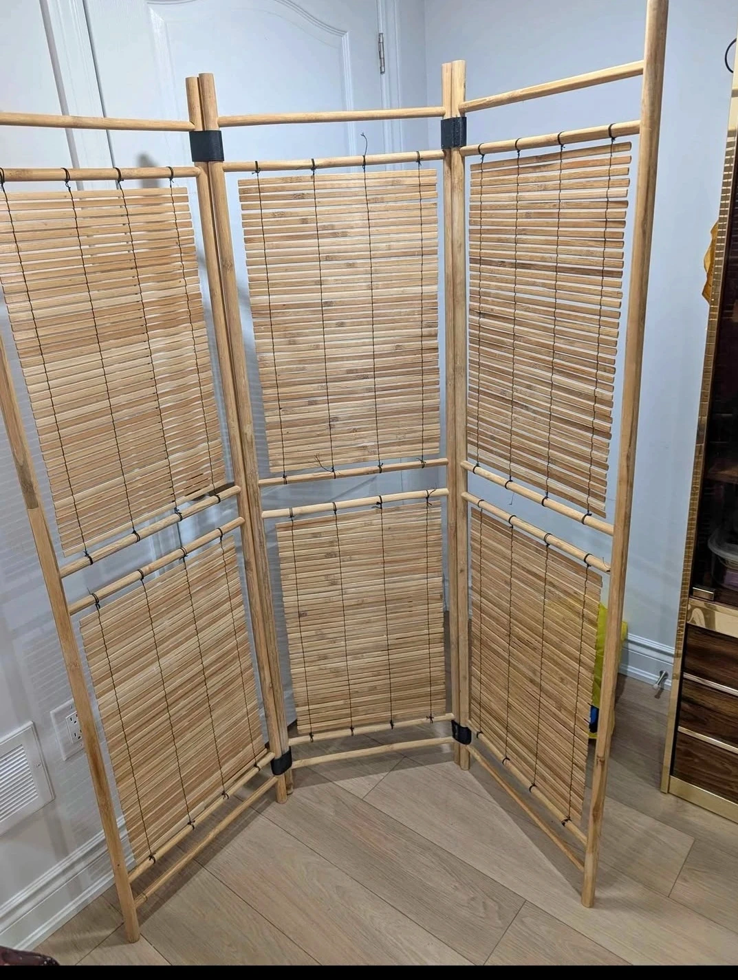 This is a 3-panel room divider made from bamboo. It's perfect for separating spaces or adding a natural touch to your decor. The screen's panels are adjustable for various configurations.