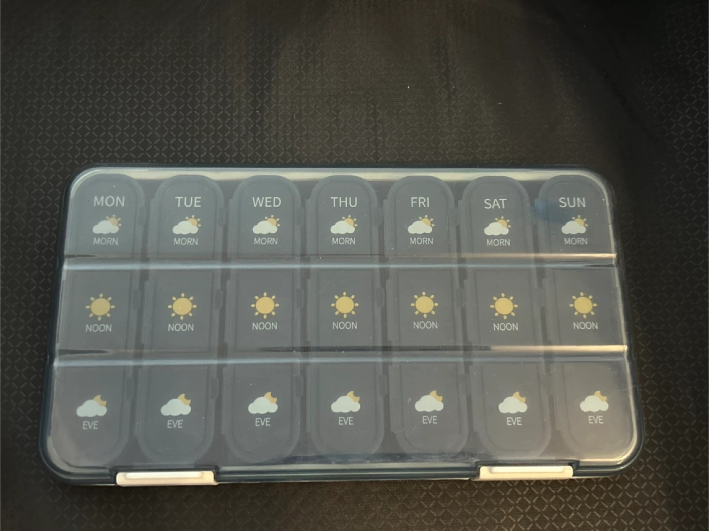 Keep your pills organized with this weekly pill organizer case! It has compartments for morning, noon, and evening for each day of the week.