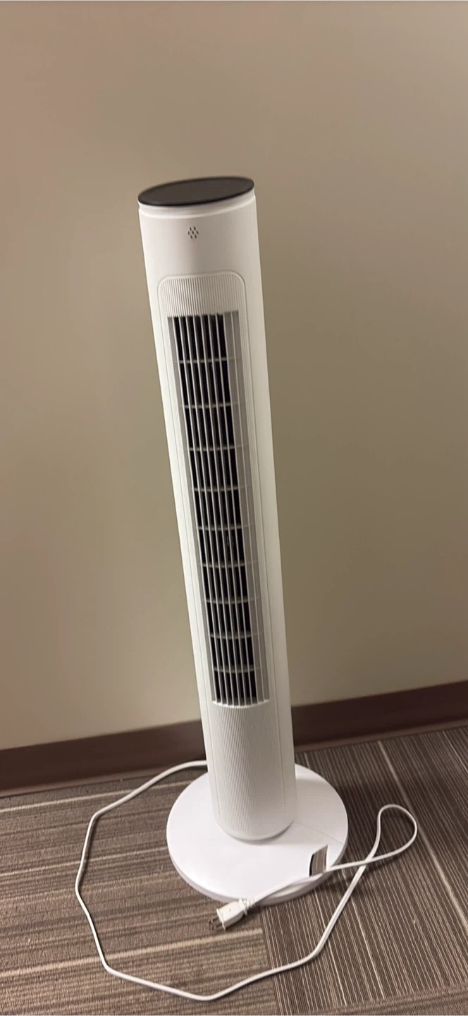 100cm/39in tall. Includes a remote control, it has multiple fan speed settings and a timer function up to 4 hours. Fits well in any room.