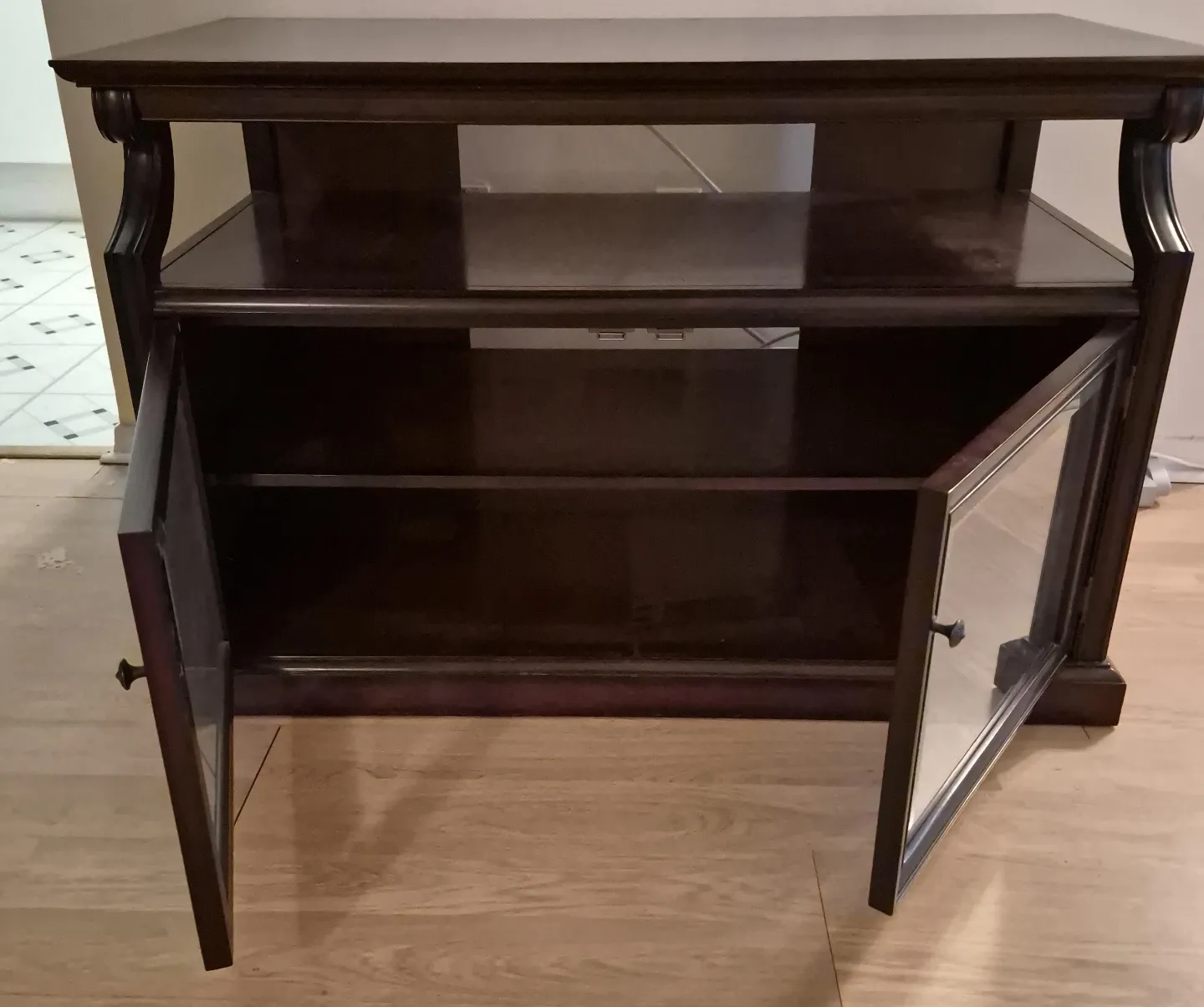 A dark wood TV media console with two open shelves and two glass-fronted cabinets. It has a classic design with curved side supports. Plenty of storage for electronics or display items.