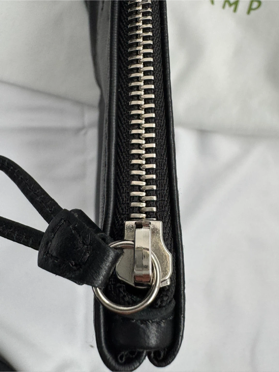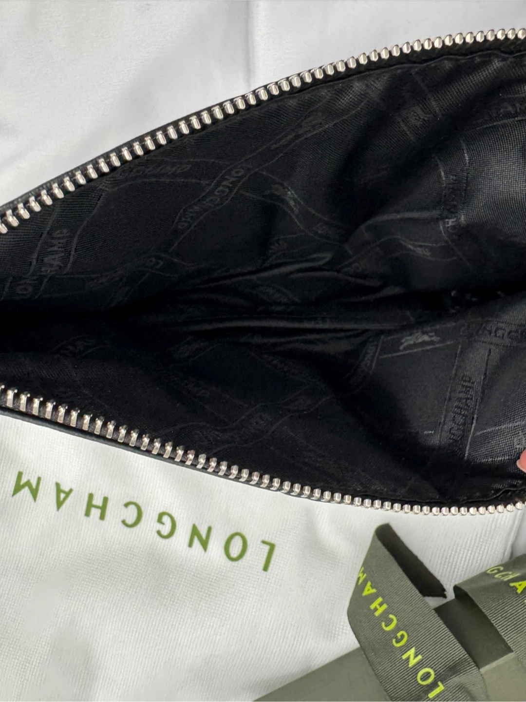 This is a Longchamp pouch in black leather. It features the signature Longchamp toggle closure and a zippered top. Includes original box and dust bag.