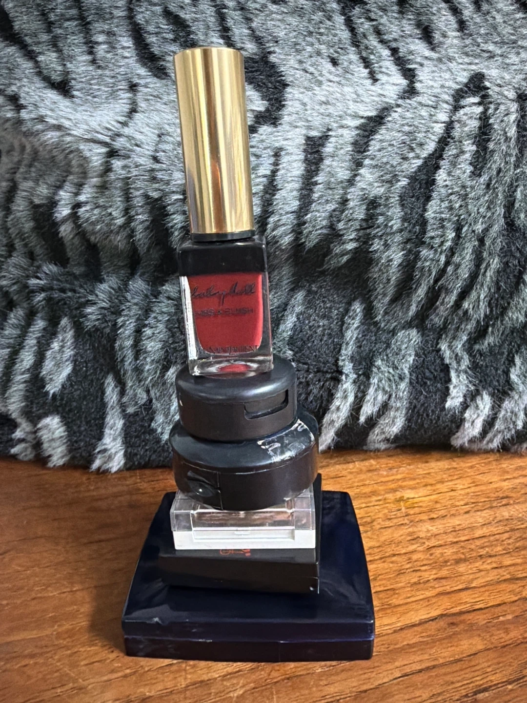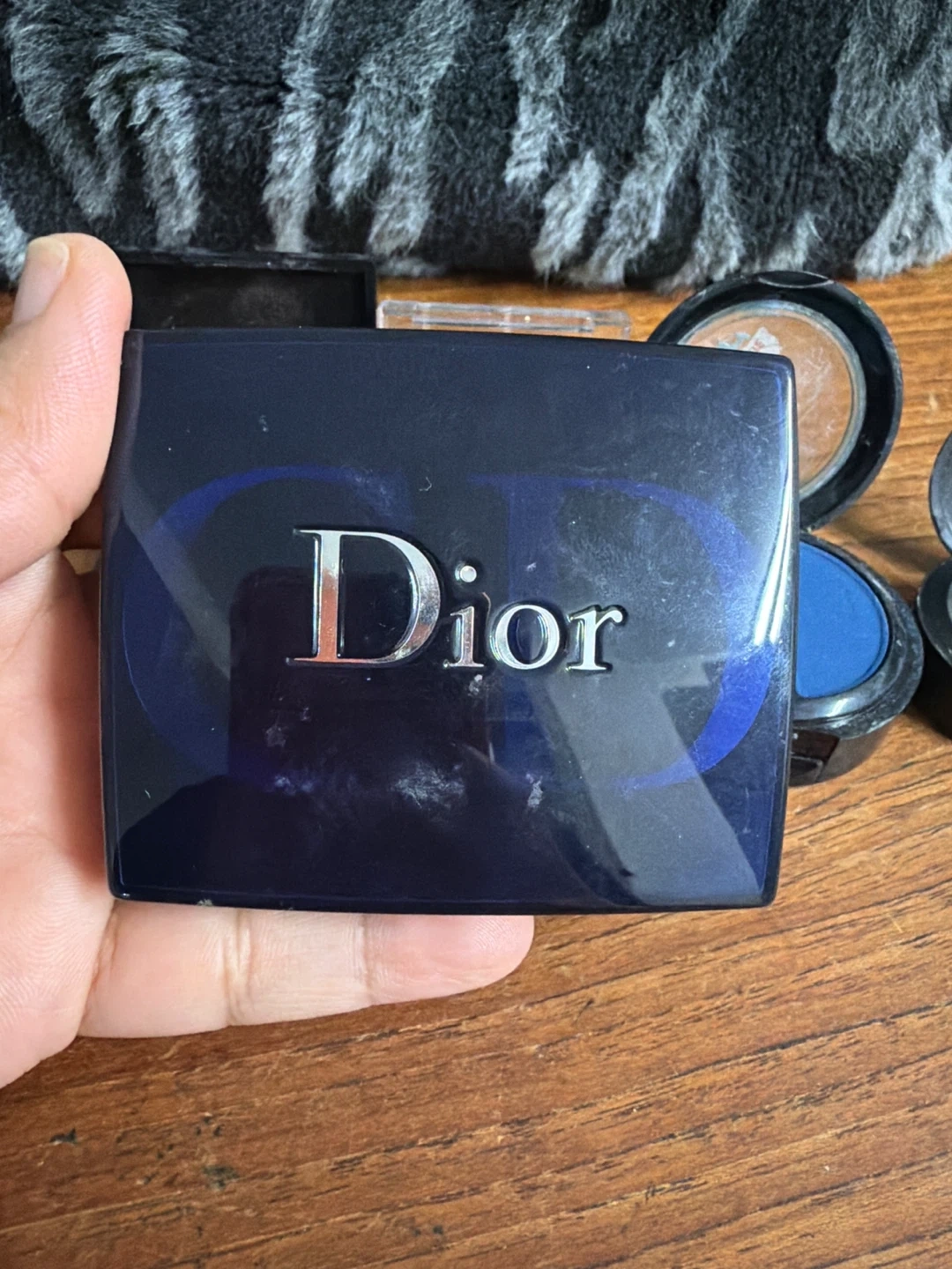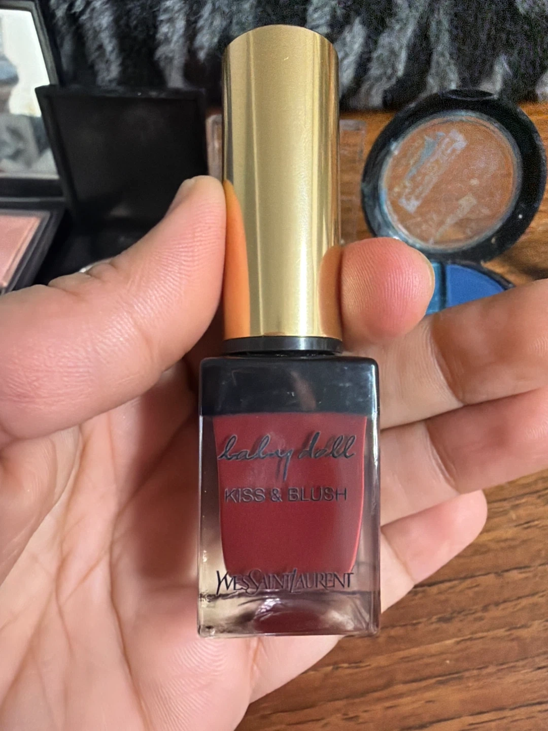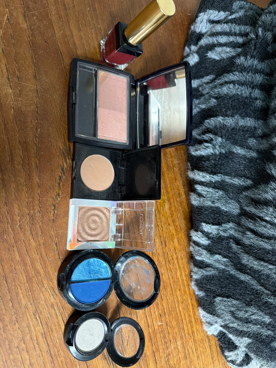 Includes YSL Baby Doll Kiss & Blush, Dior powder, MAC eyeshadows, and L'OrΓ©al eyeshadow. A collection of various makeup products.