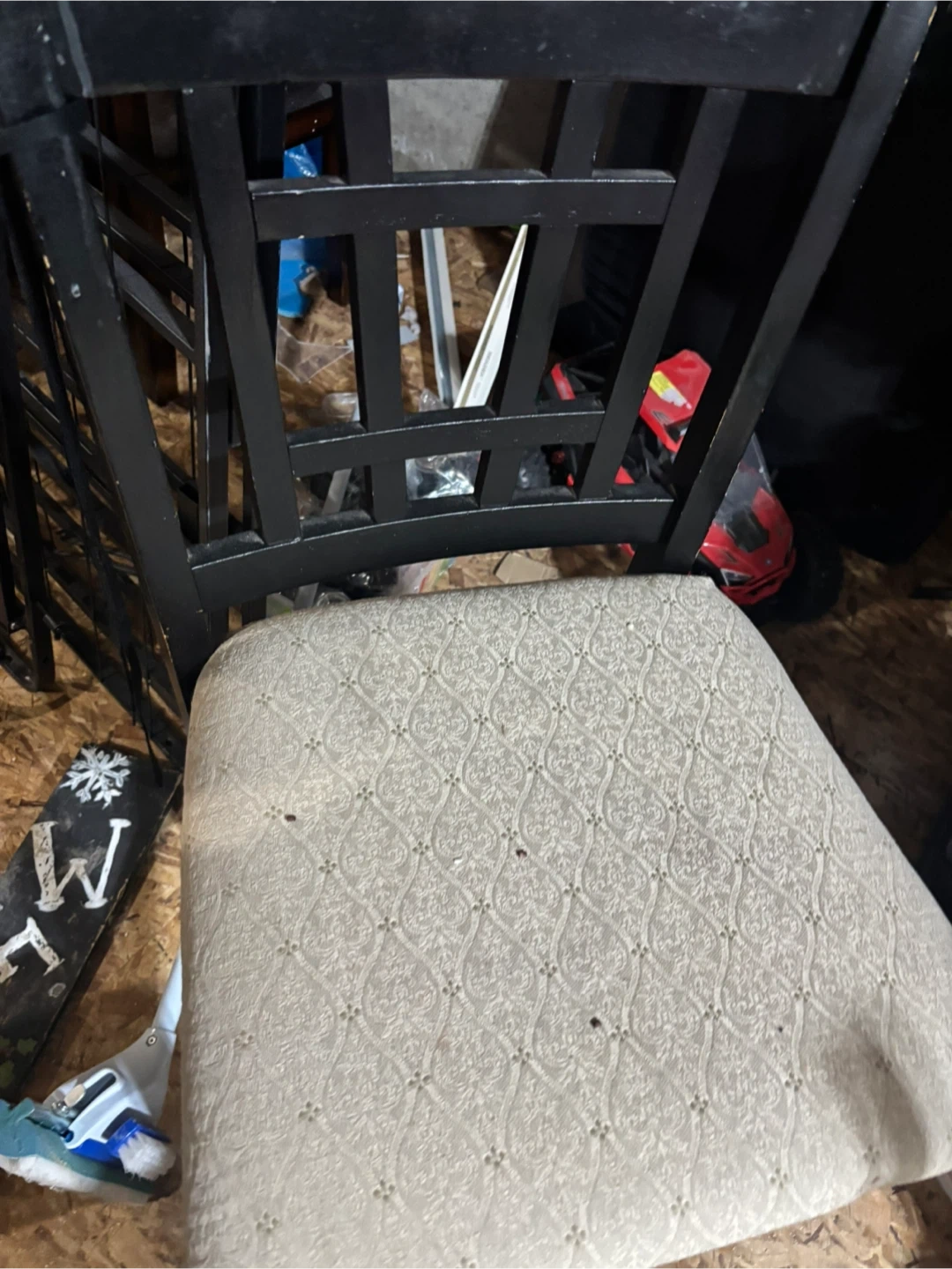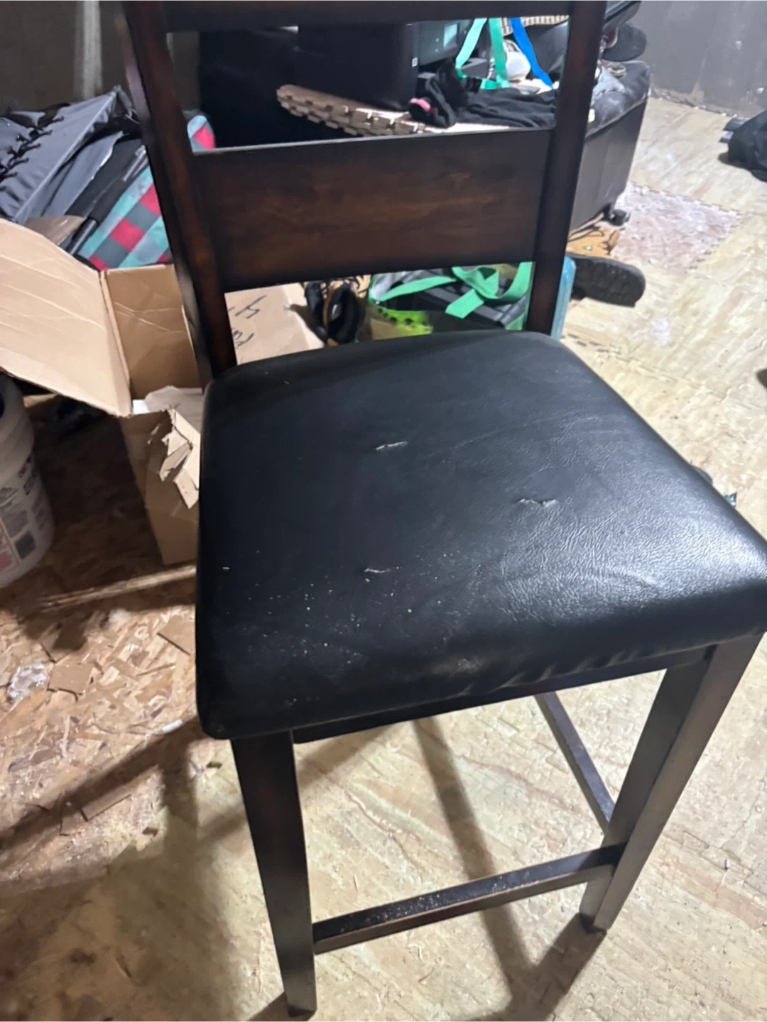 This is a wooden dining chair with a dark brown finish. It features a black upholstered seat for comfort. Chair construction is solid wood. Chair if wanted!
