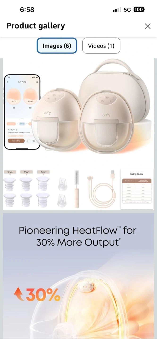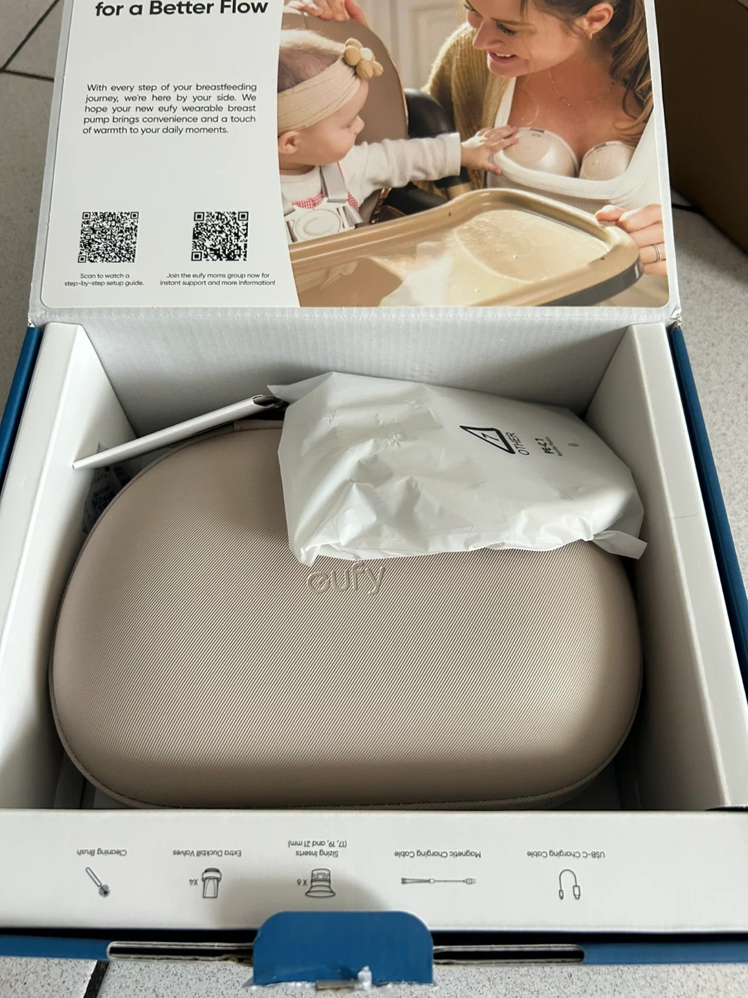 Eufy Smart Double Electric Breast Pump. This double pump comes in white and is the S1 Pro model. It includes a charging case, multiple flange sizes (17mm, 19mm, 21mm), a cleaning brush, and a USB charging cable.