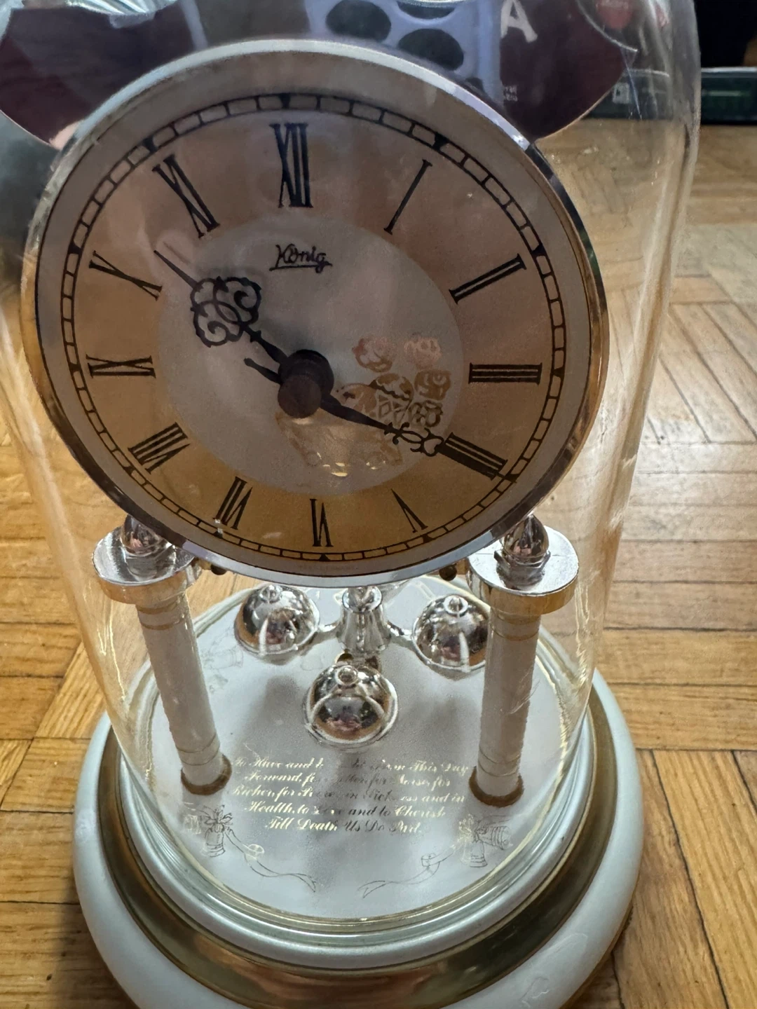 König clock housed in a decorative glass dome. It features a pendulum with three bells. The clock face has Roman numerals and intricate hands. A poetic inscription is present on the base.