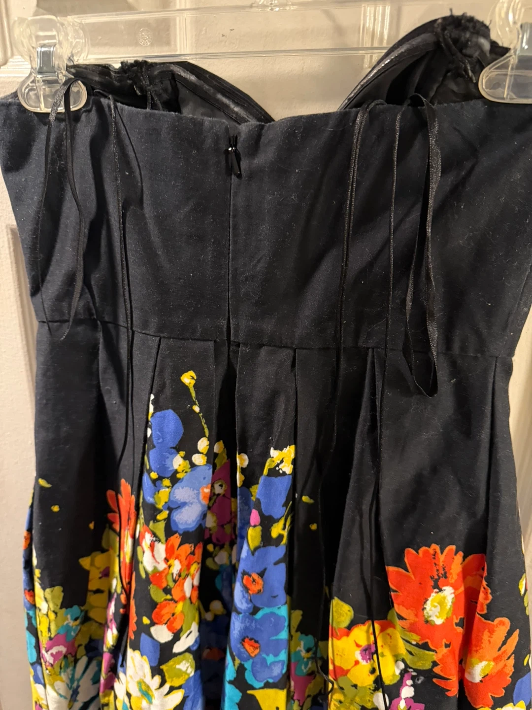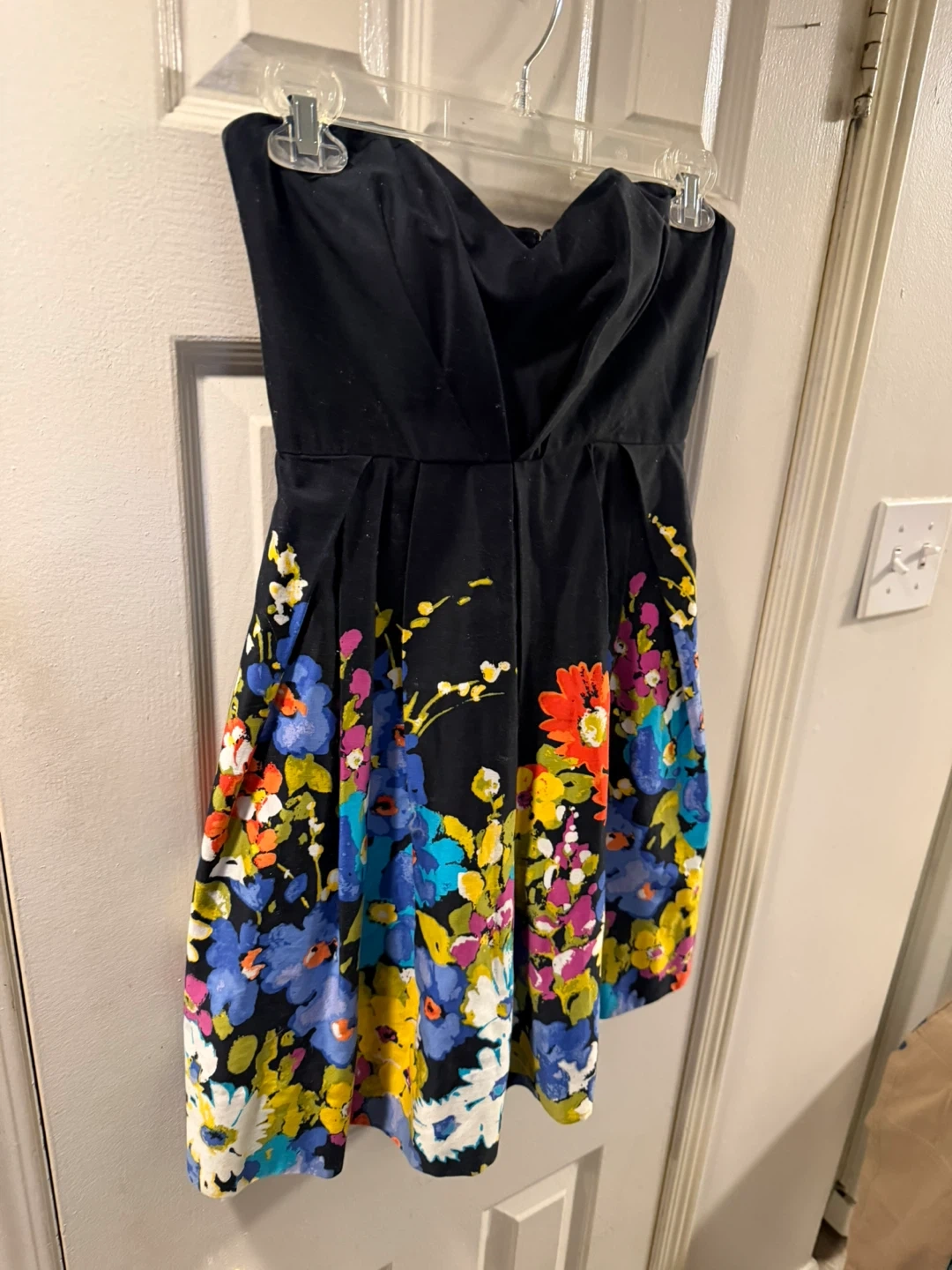 This black strapless dress features a vibrant floral print along the hem. It's a fun, summery piece perfect for warmer days. The bodice has a sweetheart neckline and the skirt is pleated.