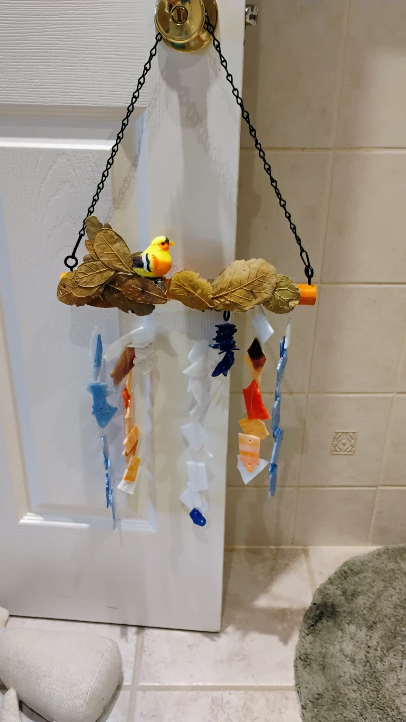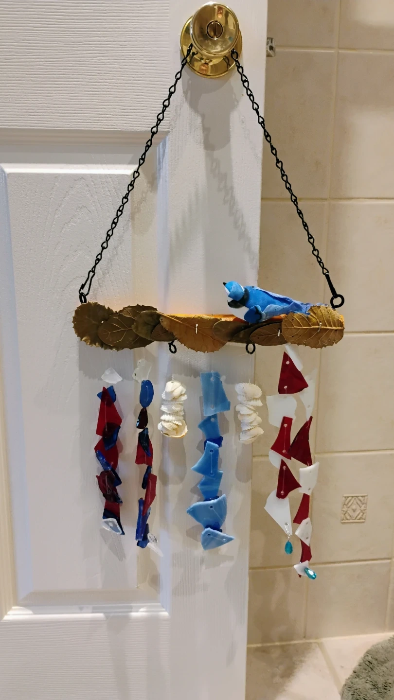 This unique wind chime features colourful glass pieces and natural shells, accented with a decorative bird. It's designed to create gentle sounds with the breeze. It hangs from a metal chain and would add a charming touch to any outdoor space.