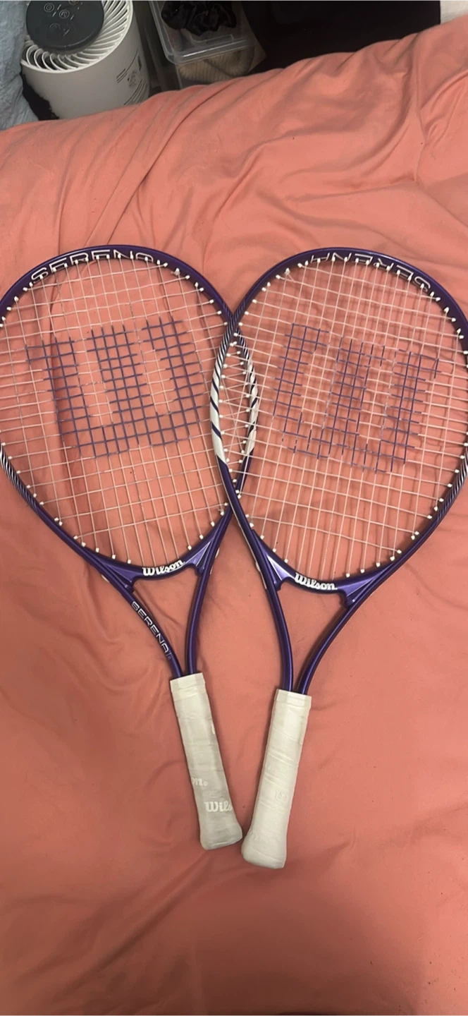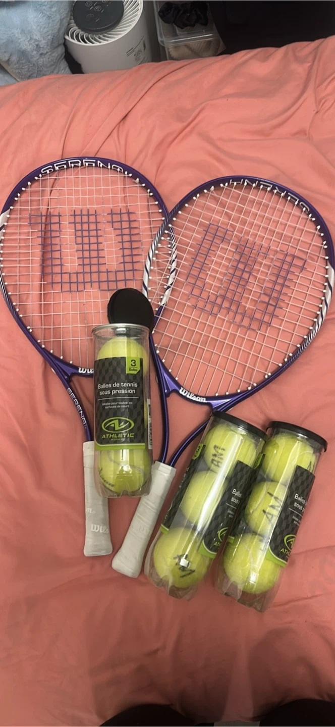 Two Wilson Serena tennis rackets and a set of Athletic tennis balls. Rackets have purple frames and white grips. Tennis balls come in a package of 3.