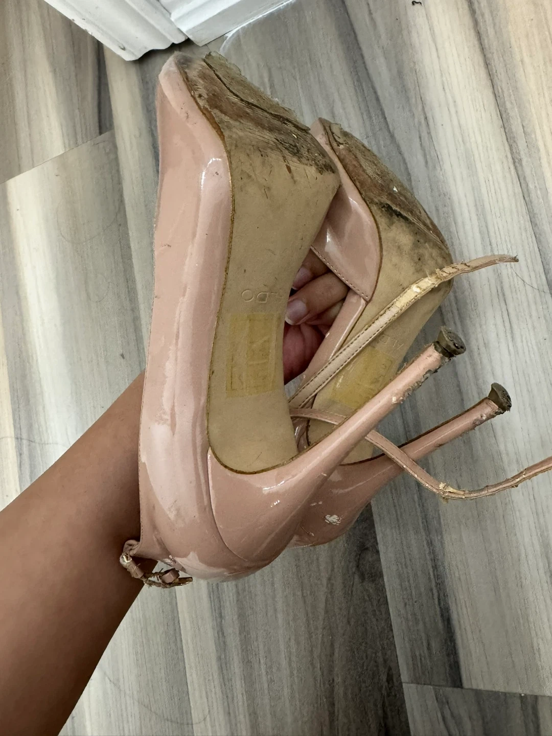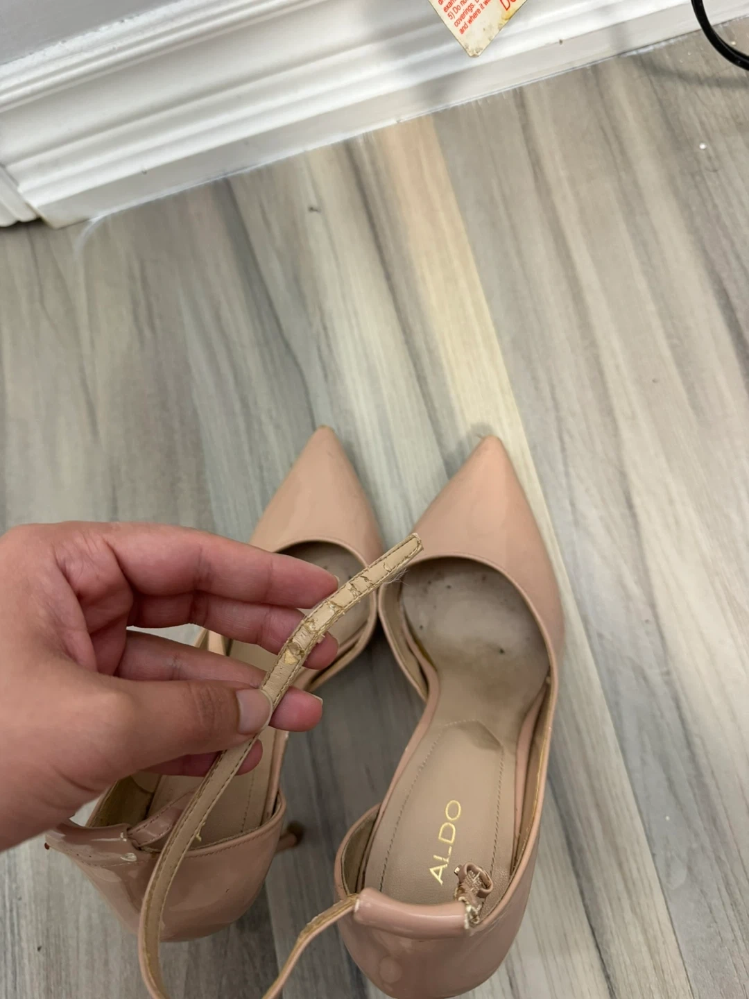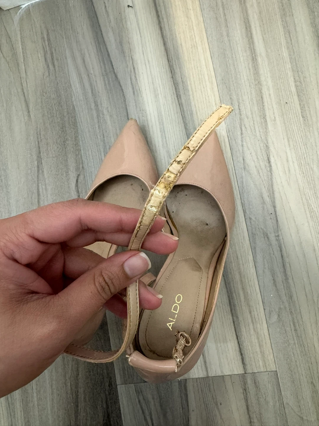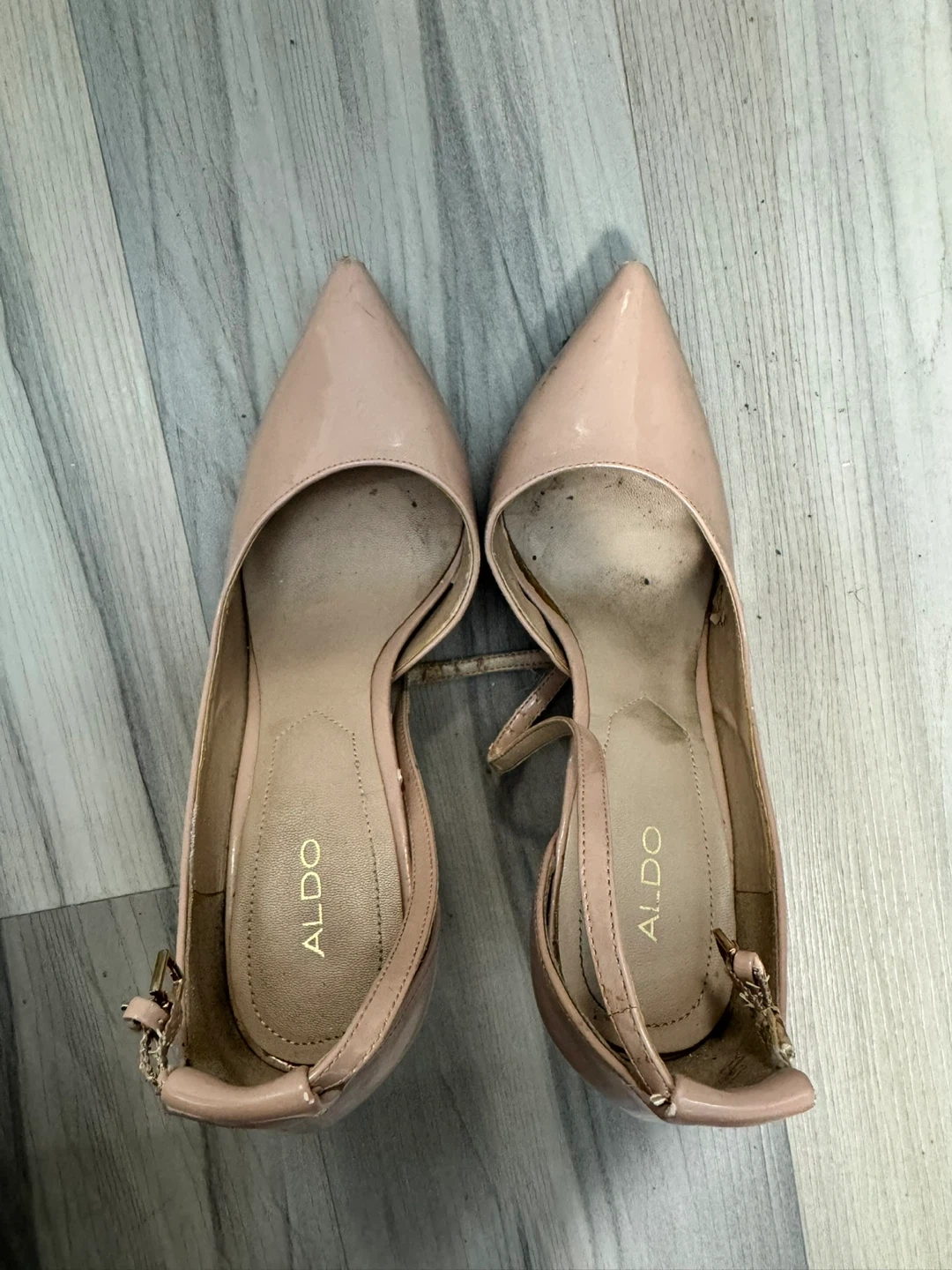 These are a pair of pink patent heels from ALDO. They feature a pointed toe and an ankle strap. The heels show signs of wear, particularly on the straps and soles.