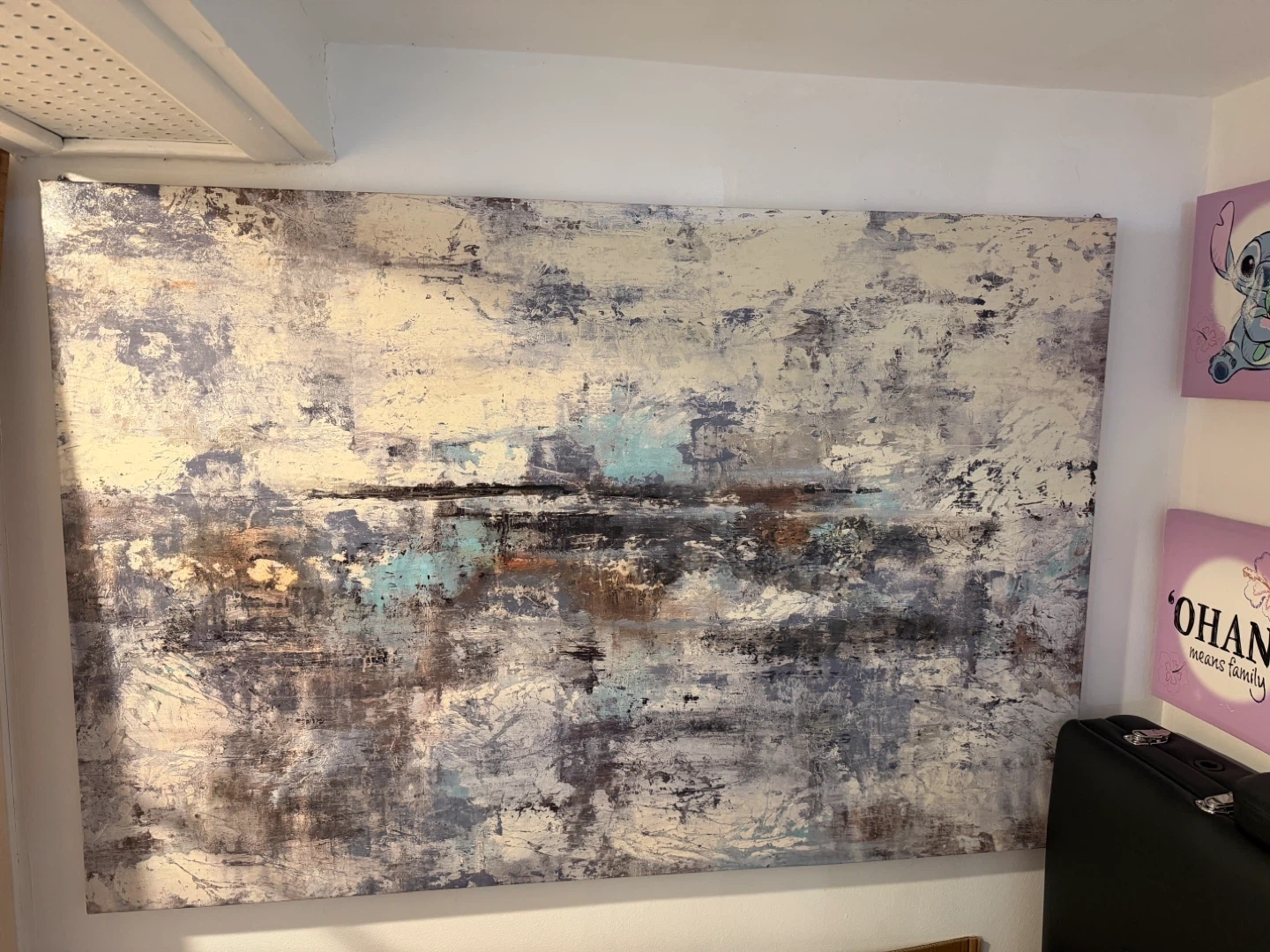 Large abstract canvas art featuring a textured landscape design. It has a blend of neutral tones with pops of blue and brown. This piece measures 36x48 inches. Adds a modern touch to any room!