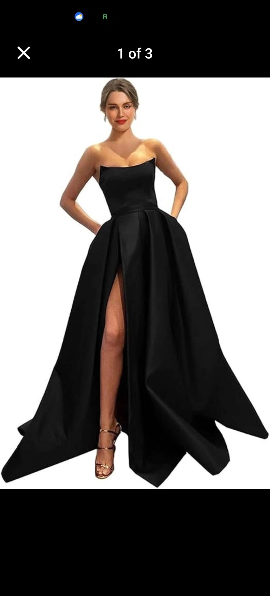 Elegant black strapless maxi dress. Features a high slit and A-line silhouette. Floor length. Perfect for special occasions.