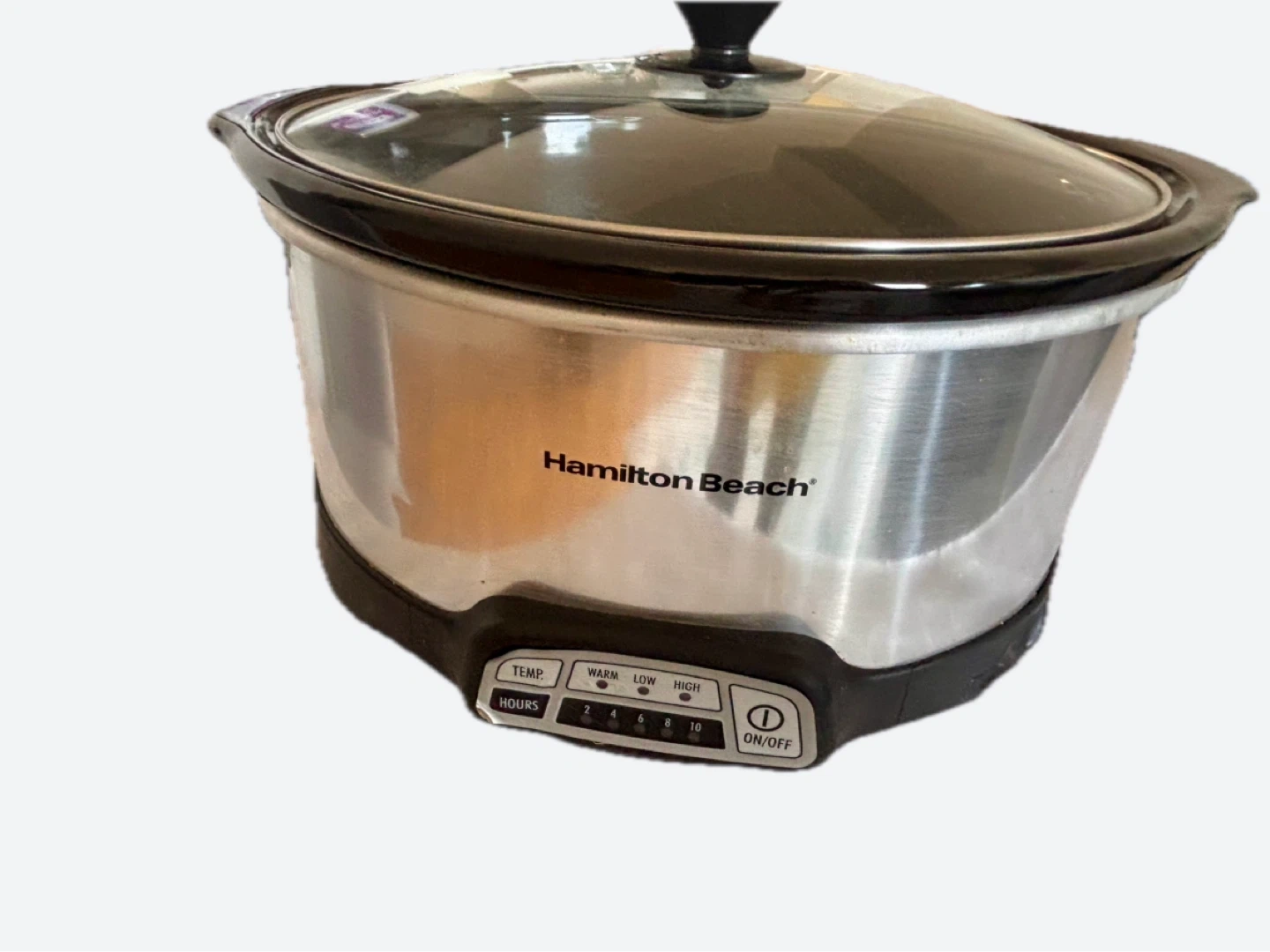 This Hamilton Beach slow cooker features a glass lid with handles and a stainless steel exterior. It has multiple temperature settings, including warm, low, and high, along with a timer function. Its stoneware insert is removable for easy cleaning.