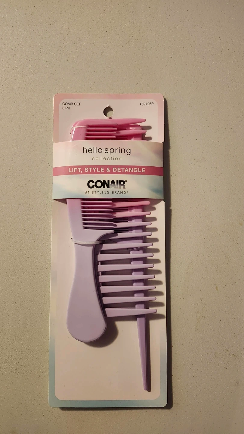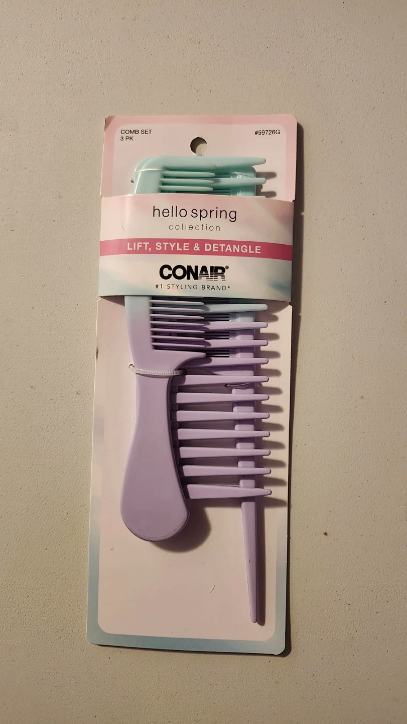 This Conair comb set includes three combs for lifting, styling, and detangling hair. The collection features pastel colours. These combs are made of plastic.