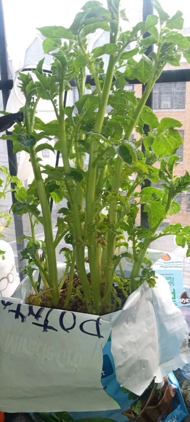 Healthy potato plants growing in a repurposed grow bag. This is a great way to start your own vegetable garden on a balcony or patio. It's perfect for anyone looking to grow their own potatoes! $9.99 for 1 stalk or $55 for the whole bag, also other plants and seeds available, just ask