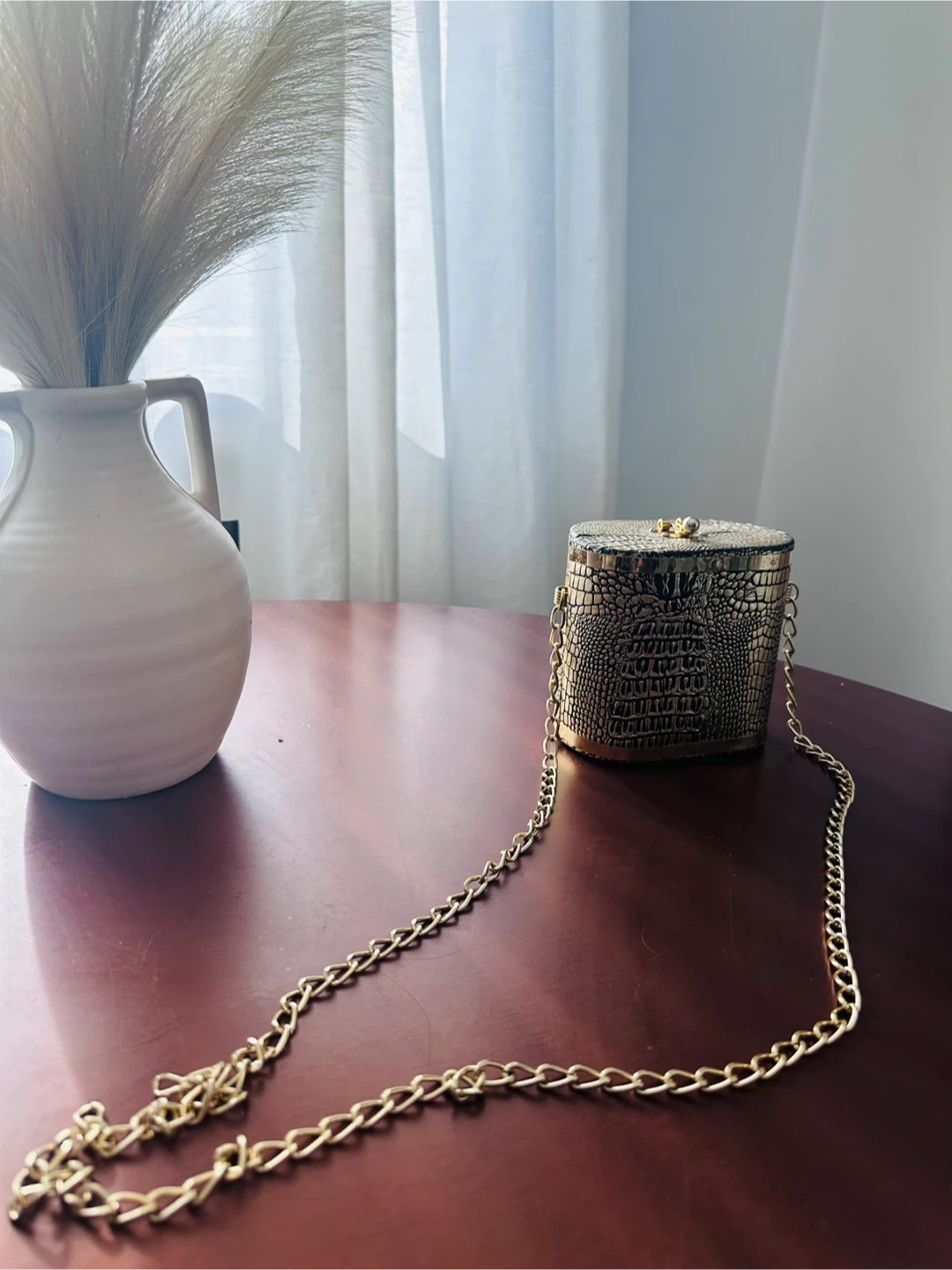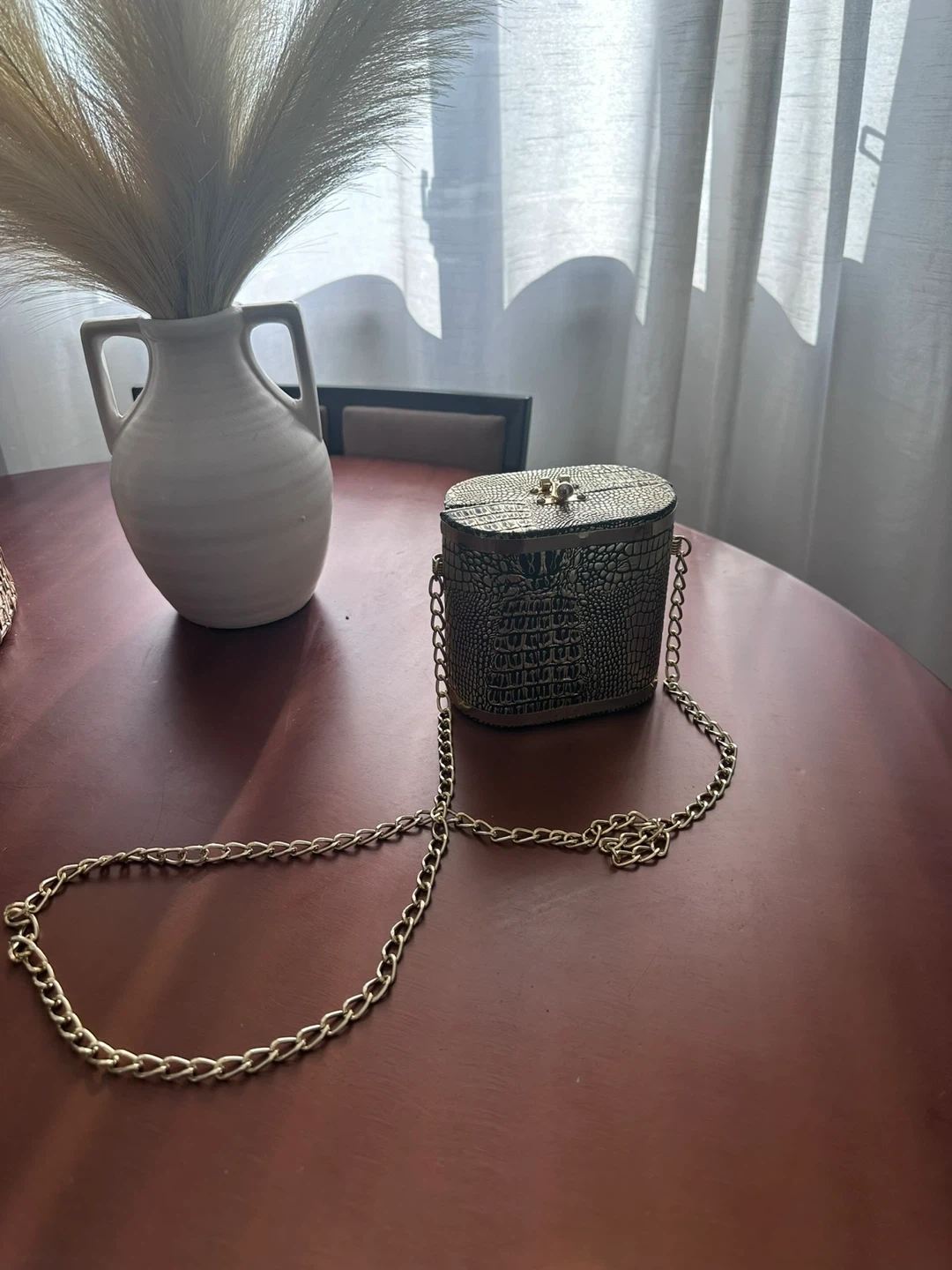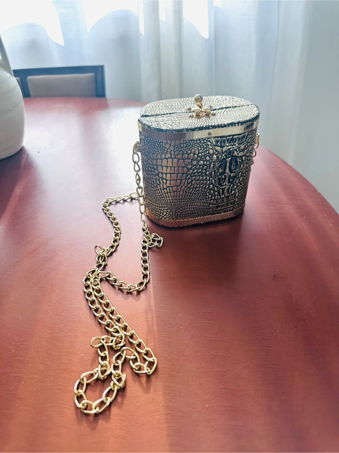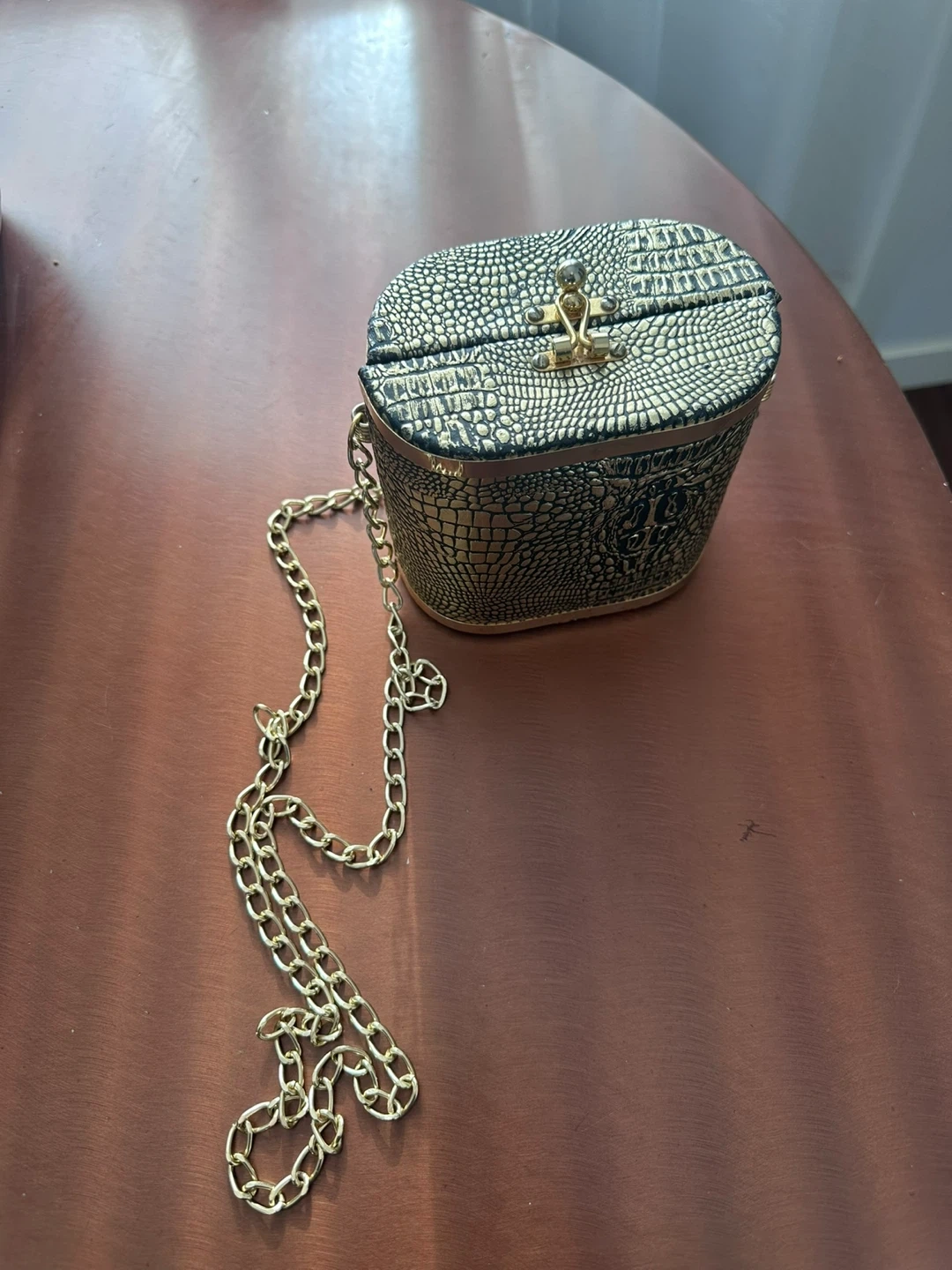 This unique oval-shaped evening bag has a textured gold crocodile pattern. It's complete with a secure clasp closure and a detachable gold chain strap. Perfect for adding a touch of glam to any outfit!