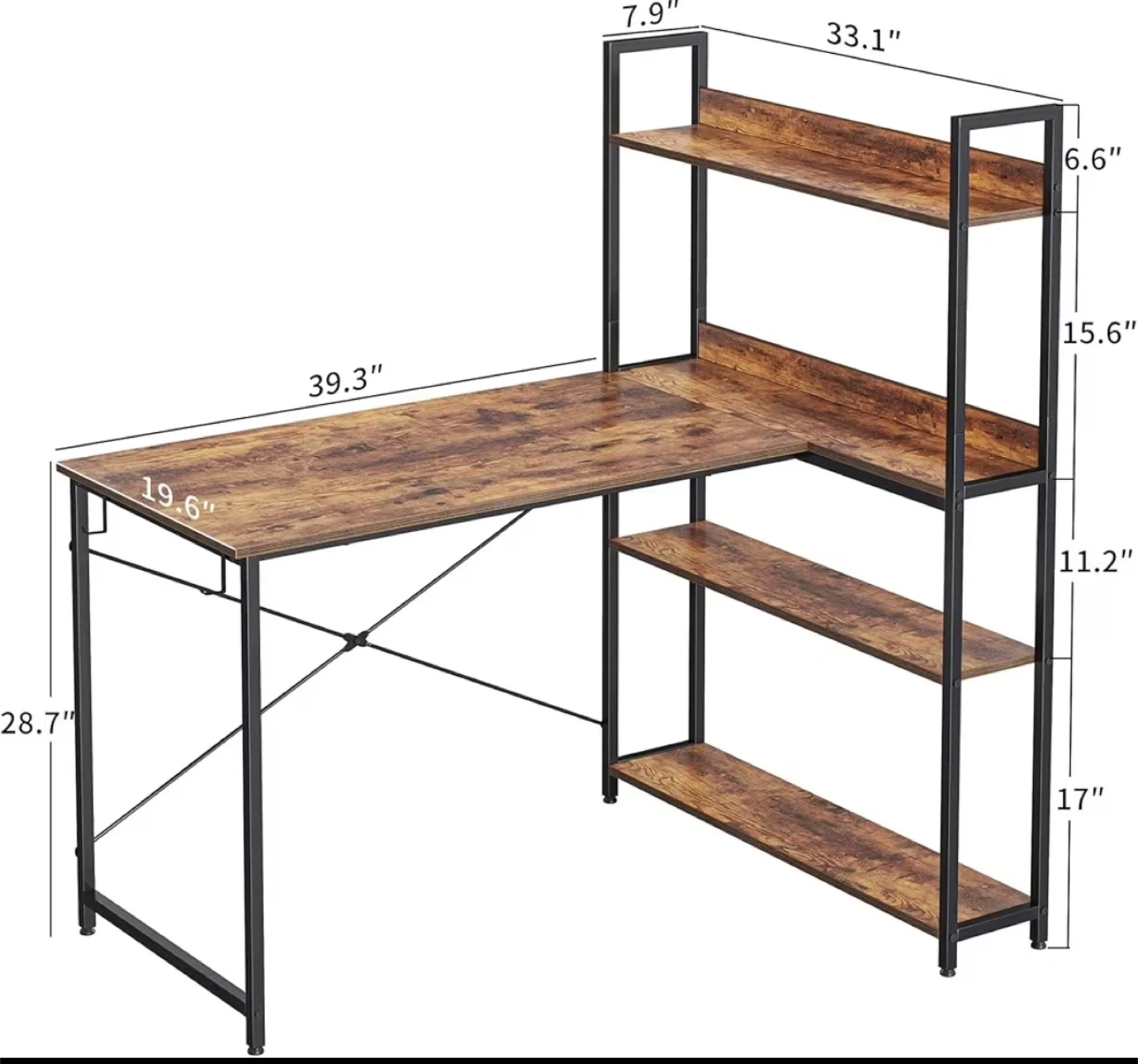 This L-shaped desk offers ample workspace with a rustic wood finish and a black metal frame. It features integrated shelving for convenient storage. The desk's dimensions are approximately 39.3" x 33.1" x 28.7" (W x D x H), with a depth of 19.6" on the longer side.