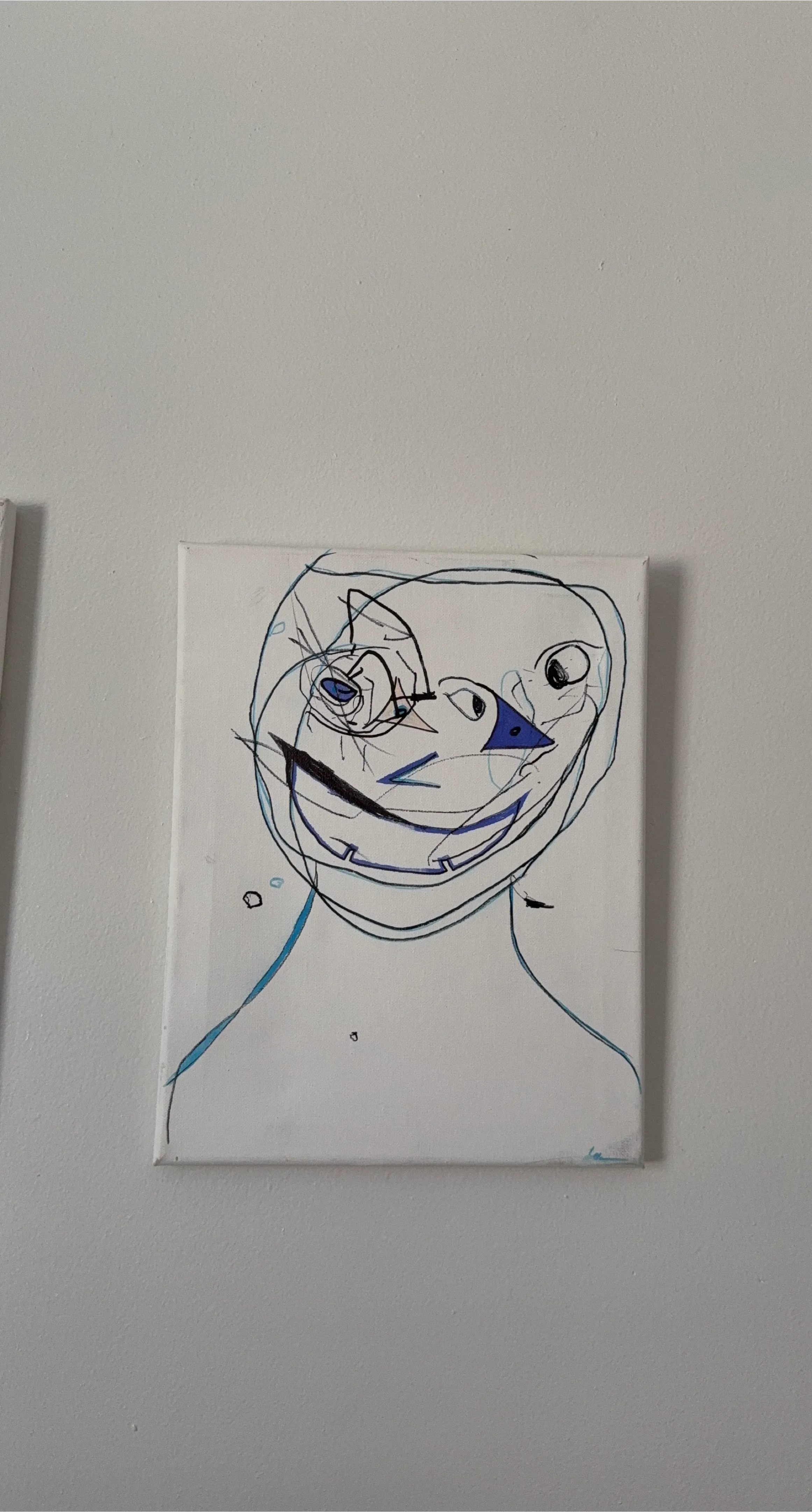 This is a unique piece of abstract line art on canvas. The artwork features a minimalist design with blue and black lines on a white background. It's perfect for adding a modern touch to any room!