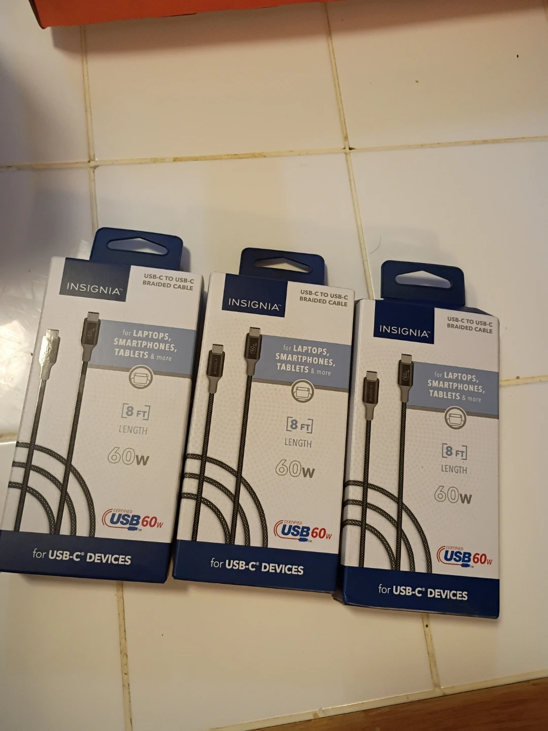 Selling three Insignia USB-C to USB-C braided cables. Each cable is 8 feet long and supports 60W charging. They're designed for laptops, smartphones, tablets, and more USB-C devices.
