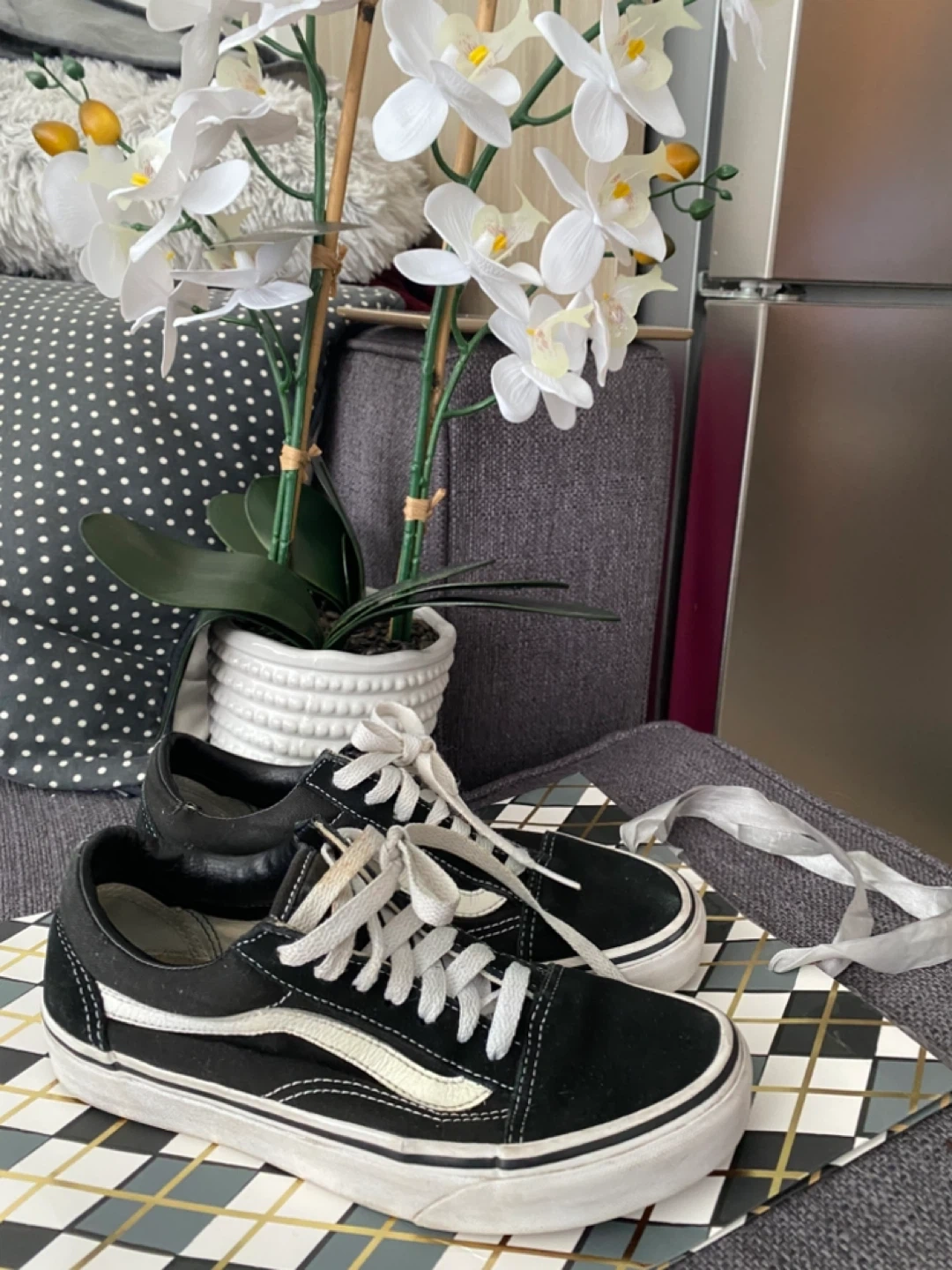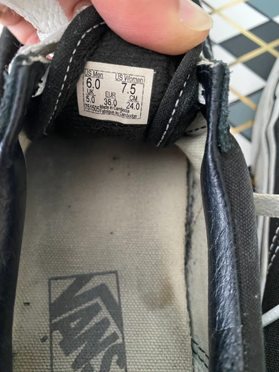 Classic Vans Old Skool sneakers in black with white stripe detail. Suede and canvas upper. These are a US Women's size 7.5 (EUR 38.0, UK 5.0). Some minor signs of wear, as shown in photos.