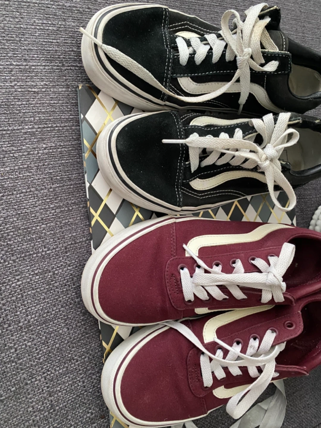 Classic Vans Old Skool sneakers in black with white stripe detail. Suede and canvas upper. These are a US Women's size 7.5 (EUR 38.0, UK 5.0). Some minor signs of wear, as shown in photos.
