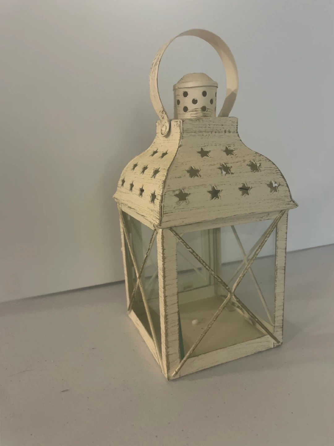 Cream metal lantern featuring decorative star cutouts and glass panels. It has a hinged door for easy access. This lantern adds a cozy touch to any space.
