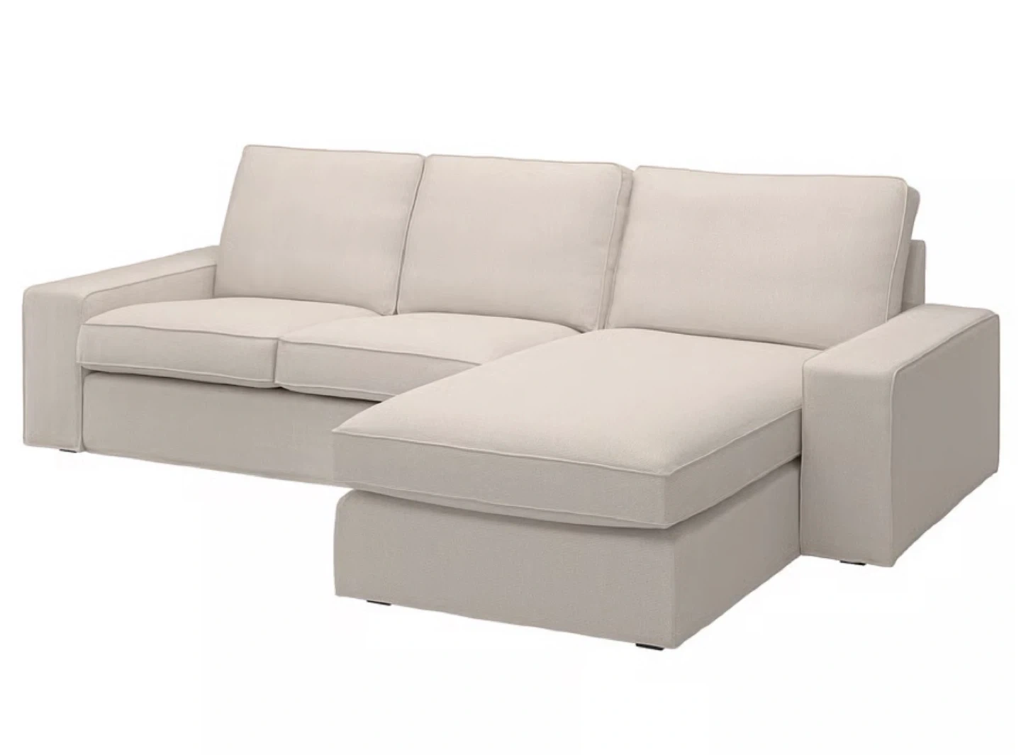 Comfortable three-seater sectional sofa in a neutral cream colour. It features a versatile chaise on the right side for extra lounging. The upholstery appears to be a durable fabric. Its clean lines make it a good fit for many living spaces.