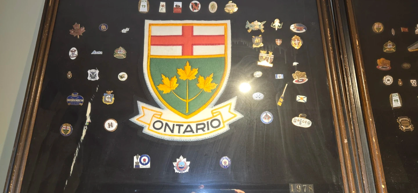 Framed display featuring the Ontario crest and numerous collectible pins. Pins depict various Canadian themes, symbols, and events. Display dated 1978 and 1979 on bottom right.