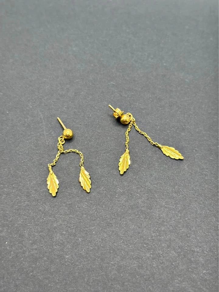 Lovely pair of 18k gold leaf dangling earrings. One of the pair doesn’t have backs. Total weight is 2.87 grams.