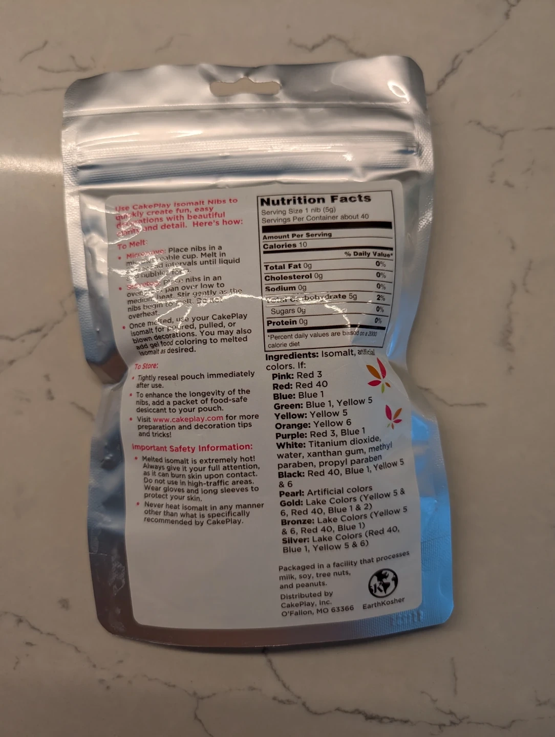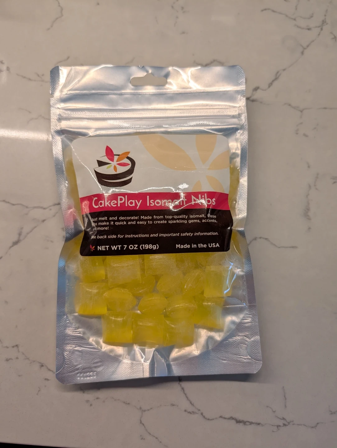 Contains 7 oz (198g) of yellow isomalt nibs. Made from top-quality isomalt for baking and decorating. Instructions and information are on the back.