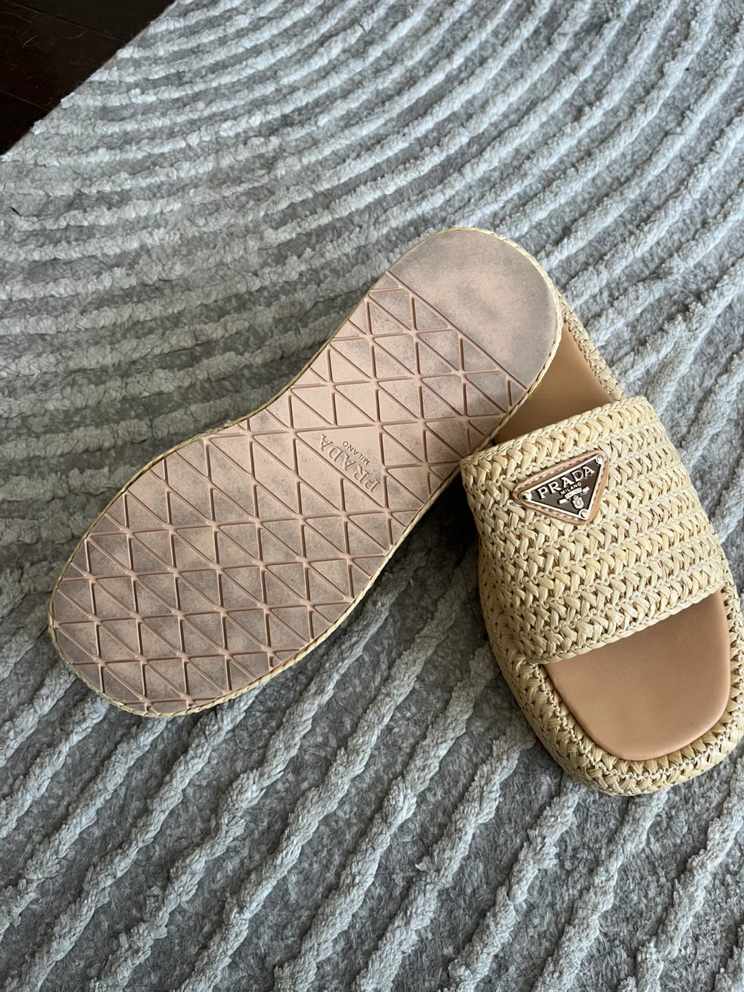 These Prada slides are crafted with a woven straw upper and a smooth leather insole. They feature the iconic Prada triangle logo on the strap. Perfect for warm weather strolls!