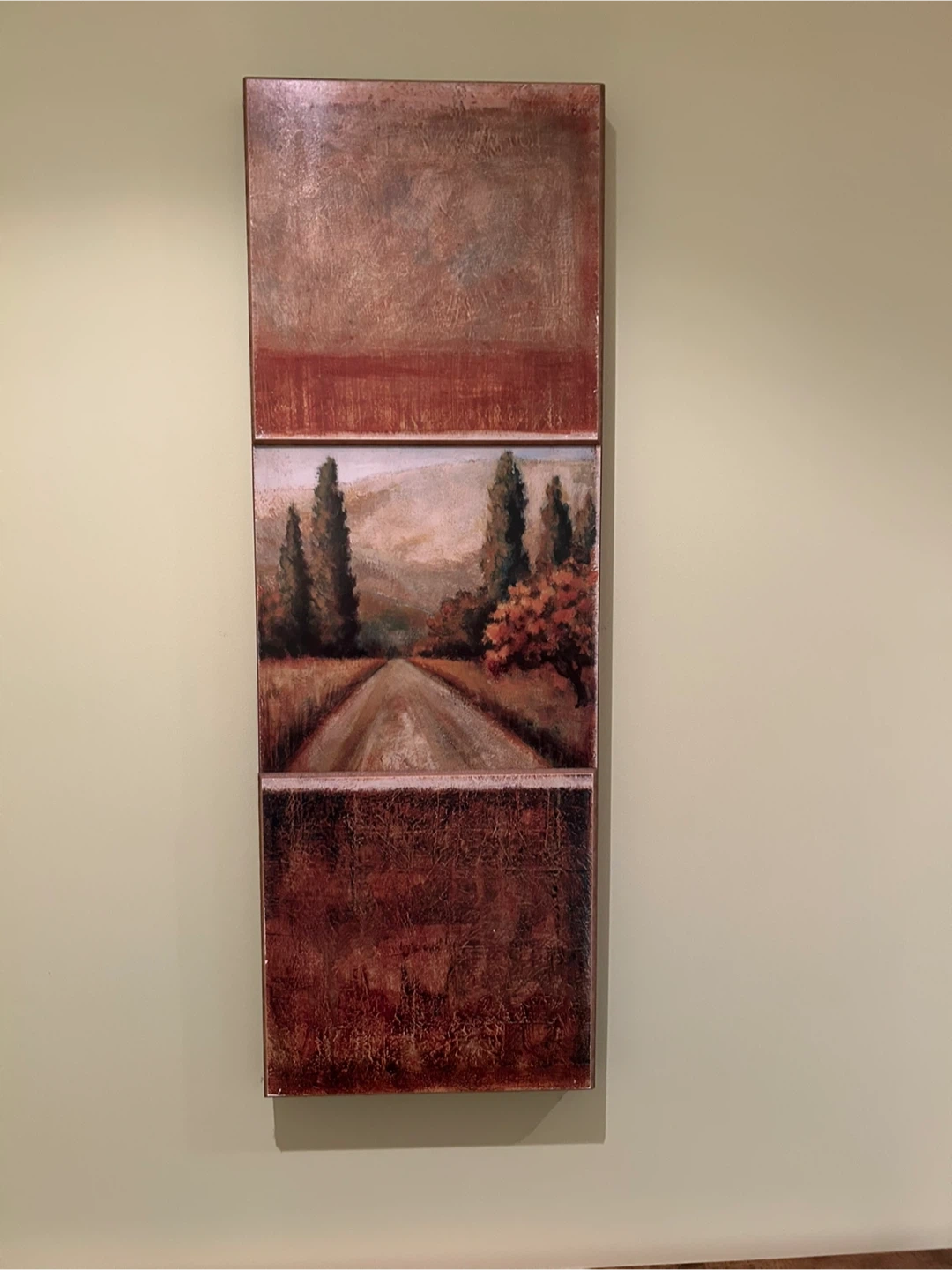 This triptych wall art features a landscape scene with a road leading into the distance. The artwork is divided into three panels with textured abstract sections above and below the central image. It's a unique piece for your home decor.