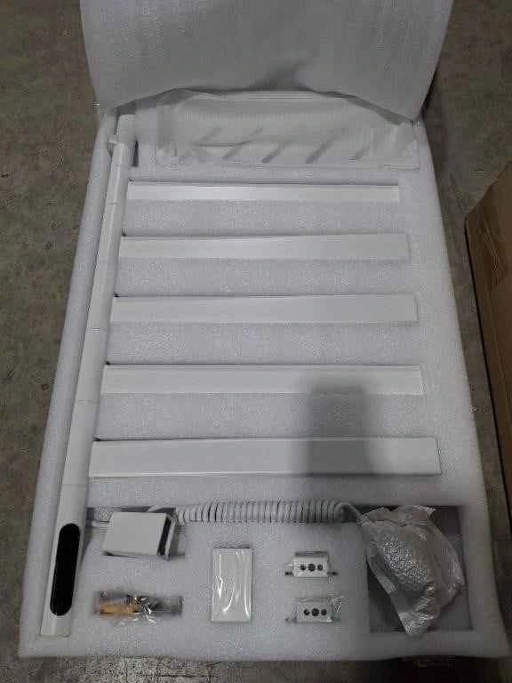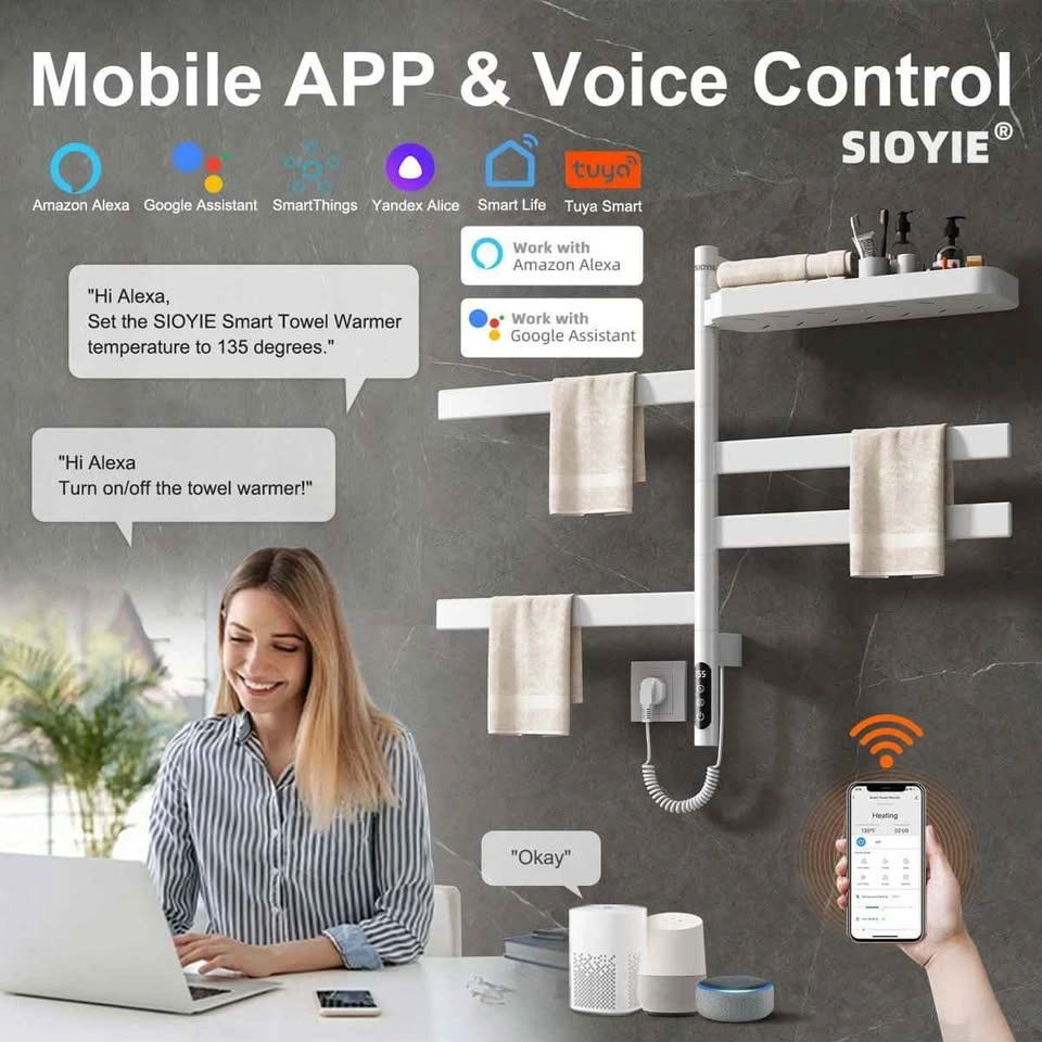 Brand new in box. Complete. Smart SIOYIE towel warmer for your bathroom. Pearl white color. Has 5 rods that rotate 180 degrees, super handy. Also has a top shelf for toiletries. You can control it with an app or voice commands like Alexa or Google Assistant. Measures about 26.77 inches tall and top shelf is 17.72 inches wide. Great for warm towels and drying them quick.