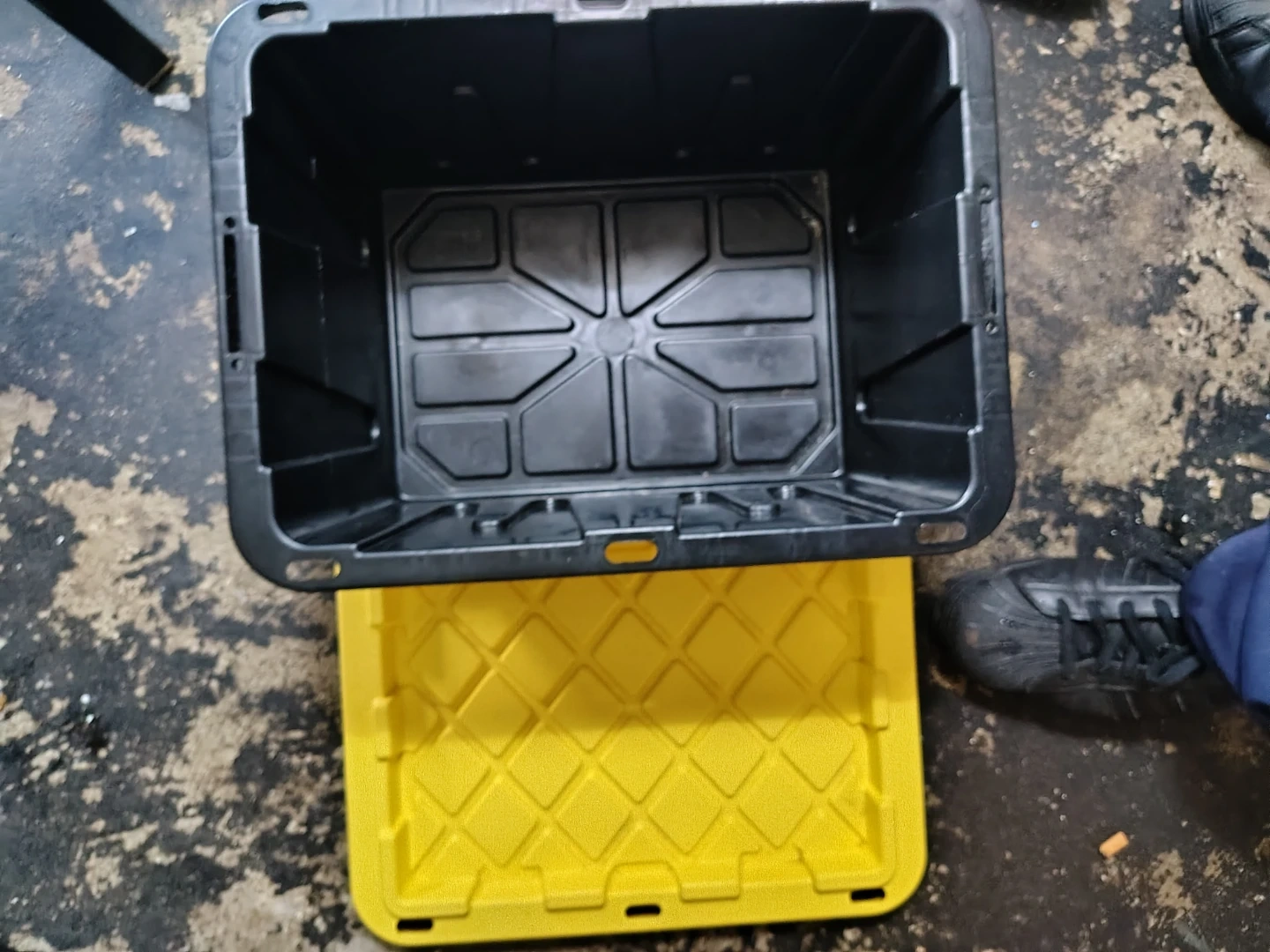 This is a black storage bin with a bright yellow lid. It's made of durable plastic and is designed for organizing items. The lid securely snaps on. It's useful for keeping tools or supplies tidy!